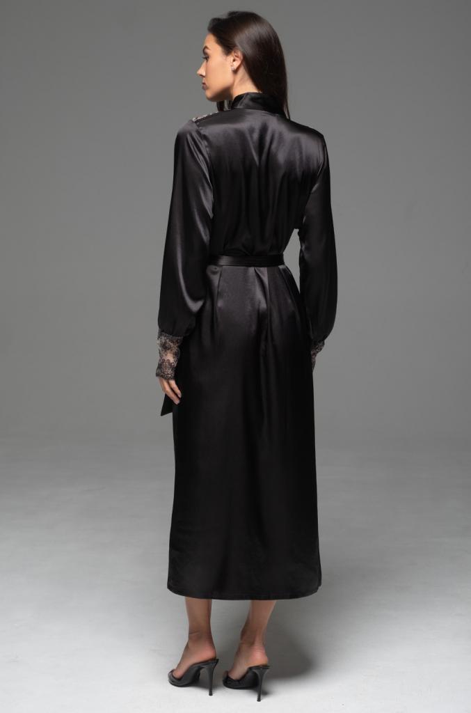 Длинный запашной халат Mia-Amore выполнен из однотонного смесового шёлка. Пышные рукава халата по низу собраны на кружевную манжету. Спереди верх халата украшен вставками из кружева. В боковых швах есть карманы. Халат запахивается с помощью широкого съемного пояса.