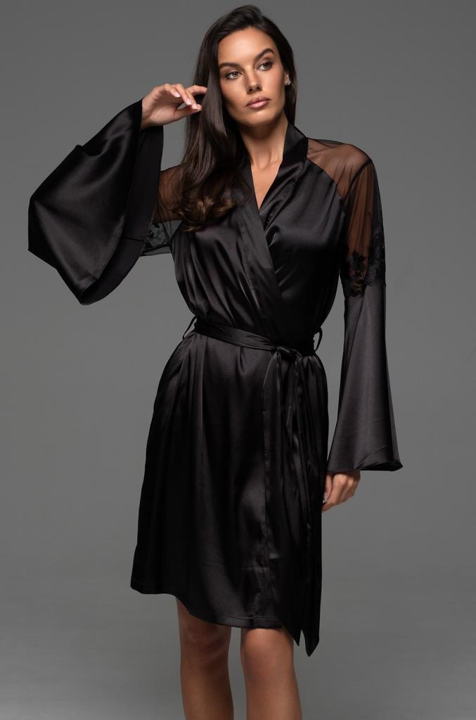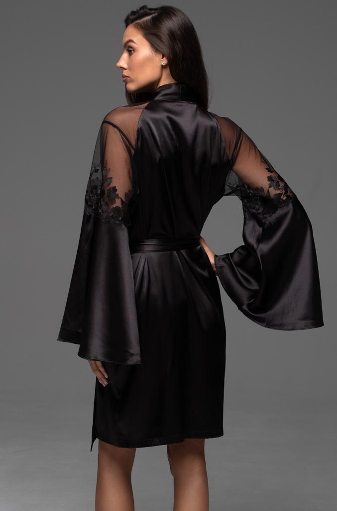 Короткий запашной халат Mia-Amore с широким длинным рукавом длиной. Халат выполнен из однотонного смесового шелка с кружевными вставками по верхней части рукава. По бокам изделия расположены карманы.