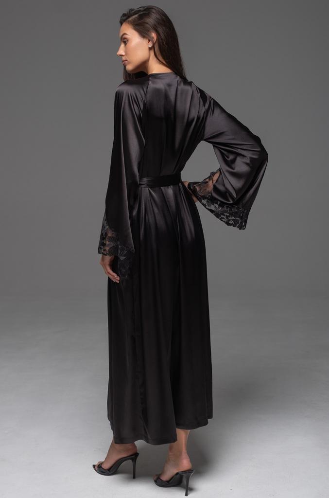 Длинный элегантный пеньюар Mia-Amore с застежкой на пуговицы по линии талии и длинным широким рукавом. Изделие выполнено из однотонного смесового шелка с кружевными вставками по бортам и низу рукавов. По бокам изделия расположены карманы. Широкий пояс идет в комплекте.