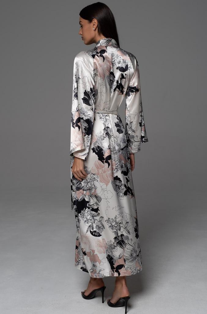 Длинный запашной халат Mia-Amore с широким длинным рукавом. Халат выполнен из принтованного смесового шелка с отделкой в виде канта по бортам. По бокам расположены карманы.
