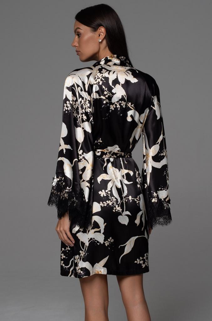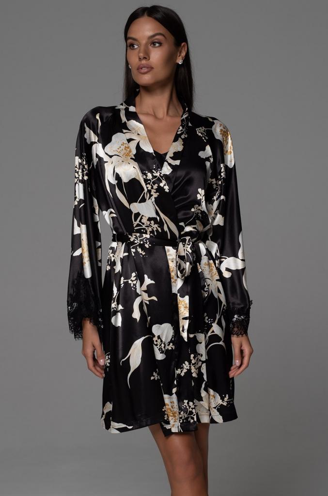 Короткий запашной халат Mia-Amore с длинными рукавами выполнен из принтованного смесового шёлка. Широкие рукава халата по низу декорированы изящным широким кружевом. Халат комплектуется поясом, в боковых швах карманы.