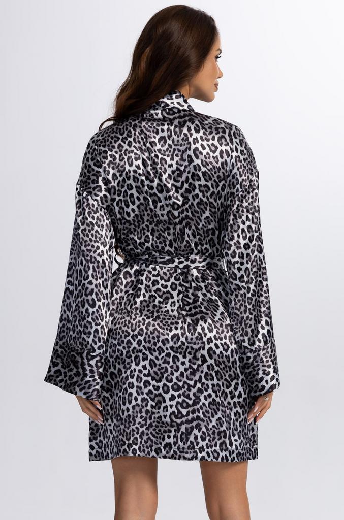 Короткий запашной халат Mia-Amore с длинными рукавами выполнен из смесового шёлка с анималистичным принтом. Халат комплектуется широким поясом, в боковых швах карманы.
