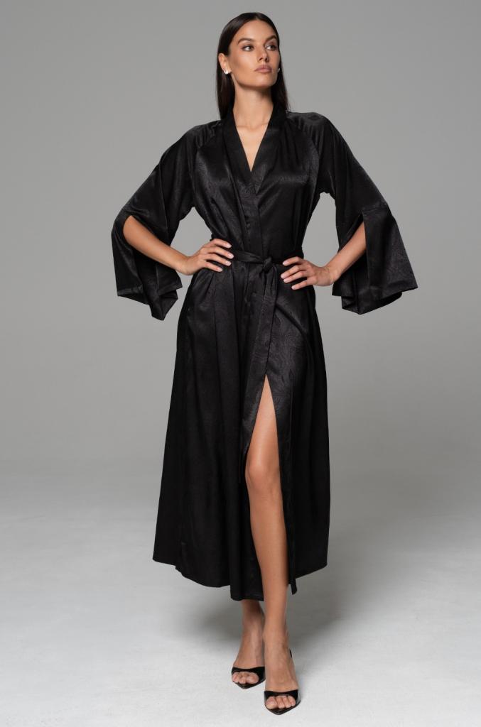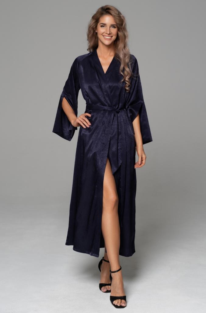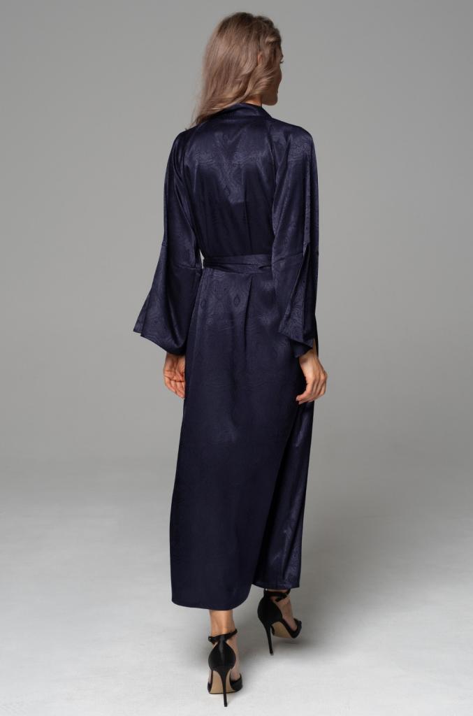 Длинный запашной халат Mia-Amore с длинным рукавом. Рукава дополнены разрезами. По бокам расположены карманы. Изделие выполнено из смесового шелкового жаккардового полотна. В комплекте широкий пояс.