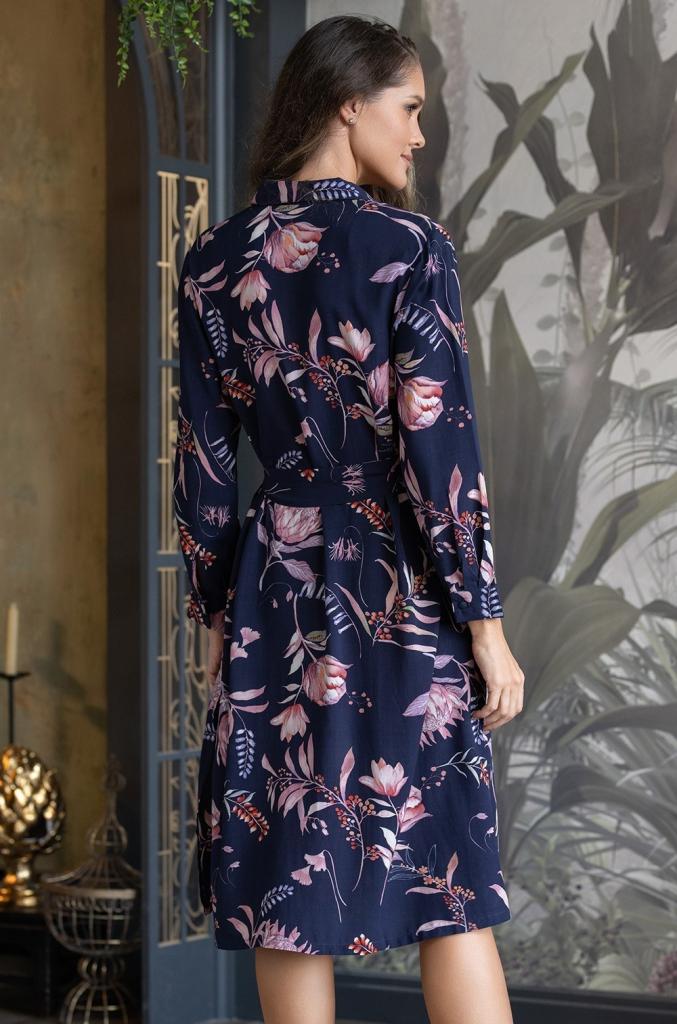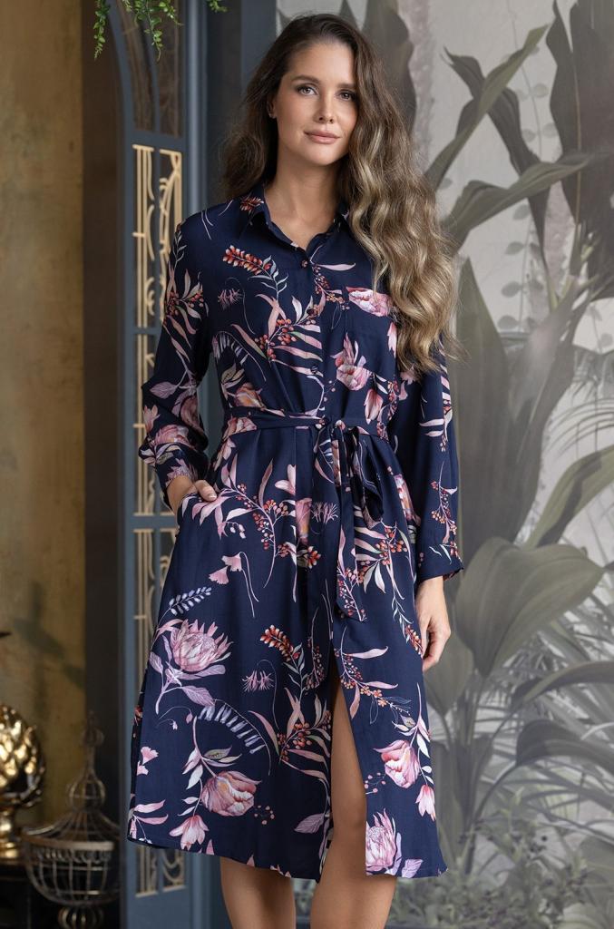 Платье-рубашка Mia-Amore с центральной застежкой на пуговицы и длинными рукавами с манжетами выполнена из принтованного вискозного полотна. По бокам рубашки по низу есть разрезы, в боковых швах карманы.