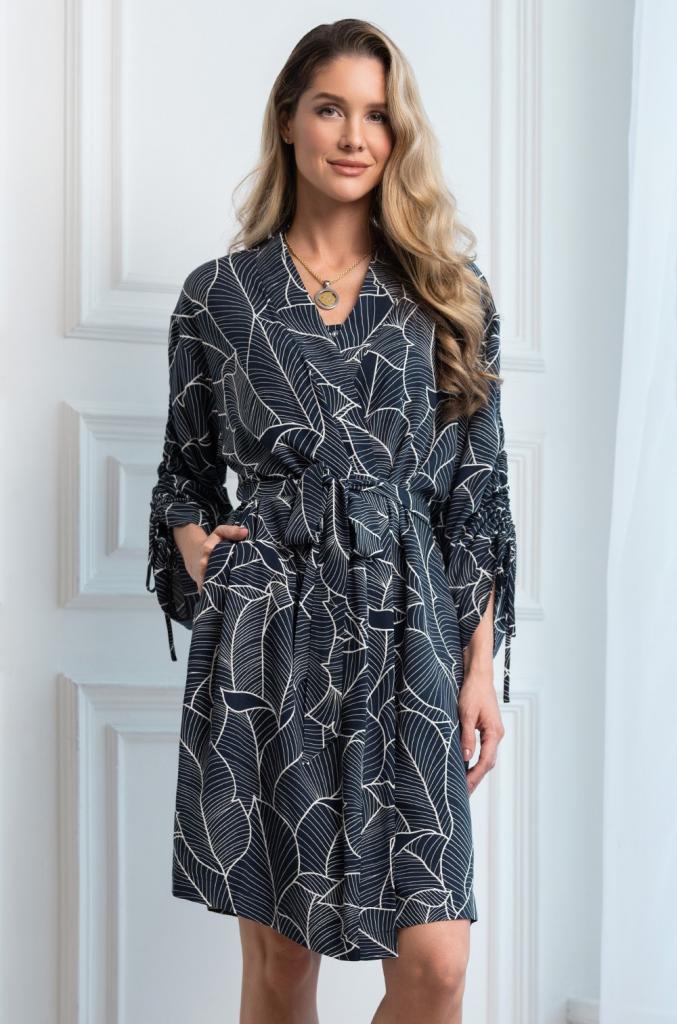 Короткий запашной халат Mia-Amore с рукавами длиной 7/8 выполнен из принтованного вискозного полотна. Длину рукавов можно регулировать с помощью декоративной кулиски. Халат комплектуется поясом, в боковых швах есть карманы.