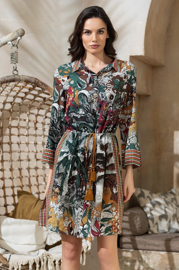 Короткая рубашка Mia-Amore с рукавом длиной 3/4. Изделие выполнено из тканой принтованной вискозы с отделкой компаньоном, имитирующей марокканскую мозаику. По низу изделия расположены разрезы для свободы движения. Линию талии можно регулировать за счет кулисы.
