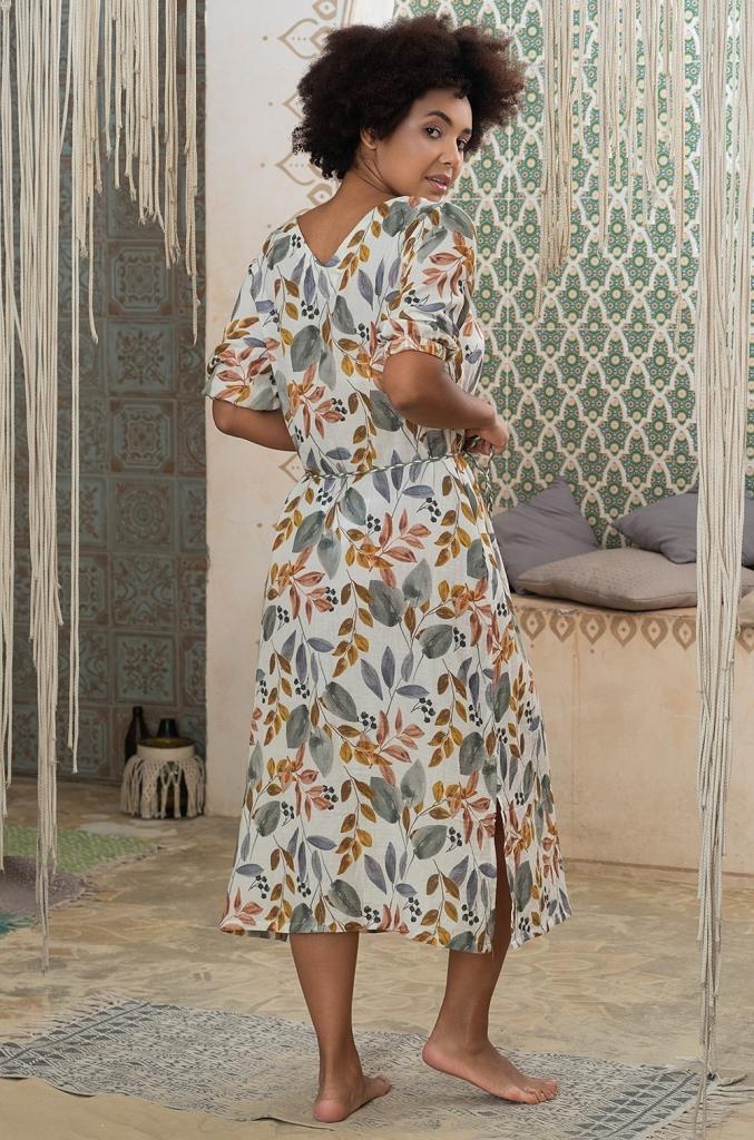 Длинная туника Mia-Amore полуприталенного силуэта выполнена из принтованного хлопкового муслина. Туника с коротким рукавом, V-образным вырезом горловины. По талии силуэт туники корректируется двухцветным поясом.