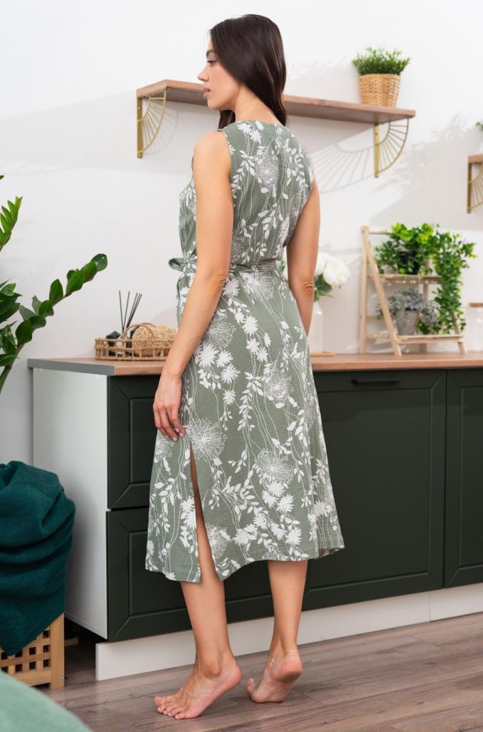 Платье Mia-Amore с плечами маечного типа выполнено из принтованного хлопкового муслина. Спереди застежка на пуговицы, в боковых швах карманы и разрезы, по талии съёмный поясок.
