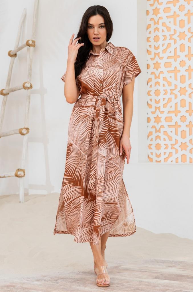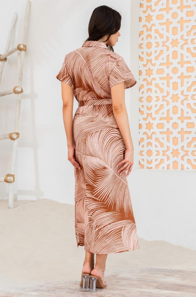 Длинная рубашка свободного силуэта Mia-Amore со спущенными цельнокроеными рукавами, с центральной застёжкой на пуговицы выполнена из принтованного льняного полотна с хлопком. По бокам рубашки по низу есть разрезы, в боковых швах карманы. Рубашка комплектуется поясом.