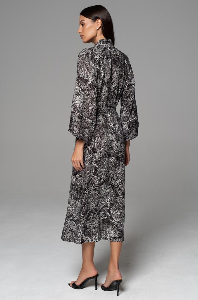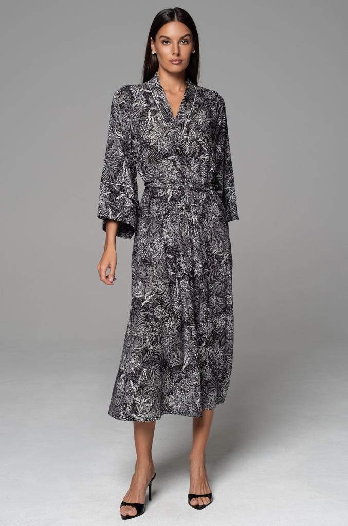 Длинный запашной халат Mia-Amore с длинным широким рукавом. Изделие выполнено из тканой принтованной вискозы с контрастным кантами по краю борта и низу рукавов. В боковых швах обработаны карманы.