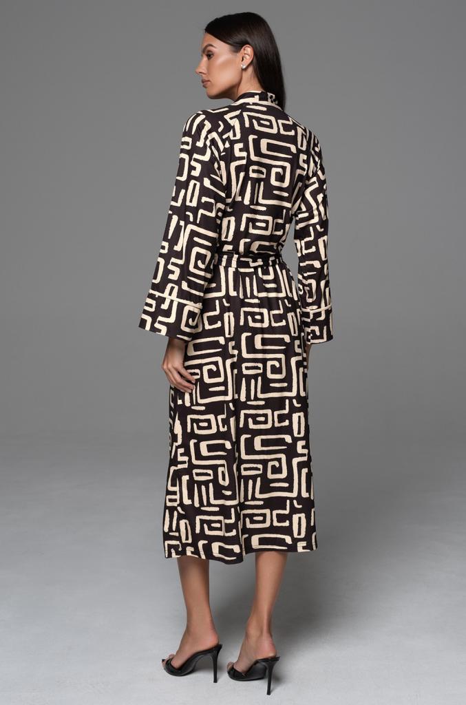 Длинный классический запашной халат Mia-Amore с длинным рукавом. Халат выполнен из принтованного трикотажного полотна. В боковых швах расположены карманы.