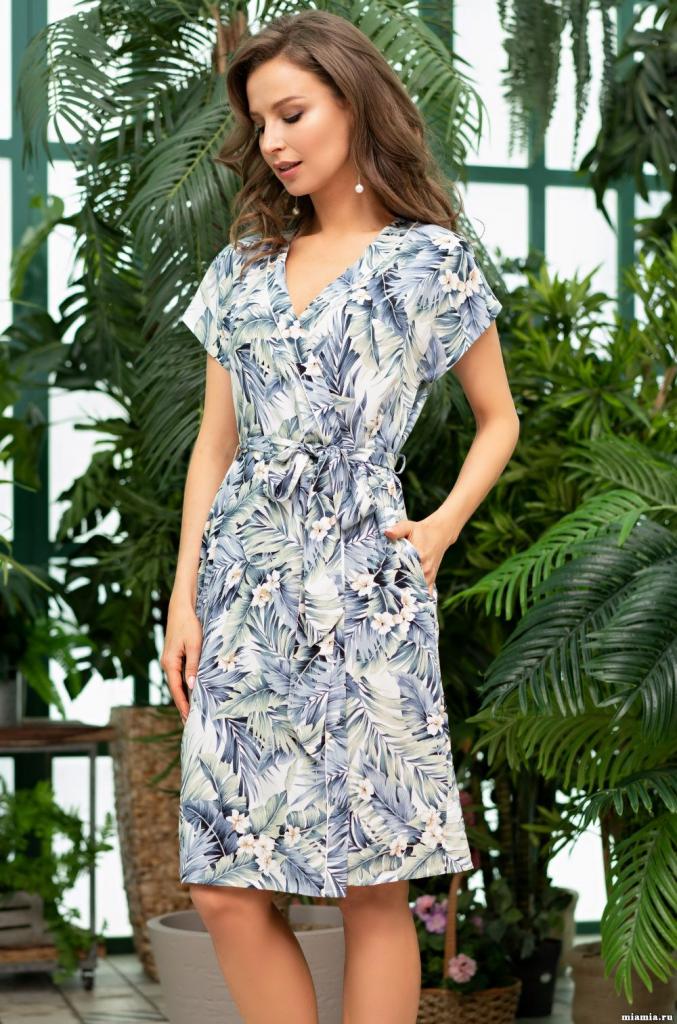 Запашной халат Mia-Amore с коротким рукавом, из принтованной вискозы с отделкой в виде белого канта по краю борта. По бокам расположены карманы.