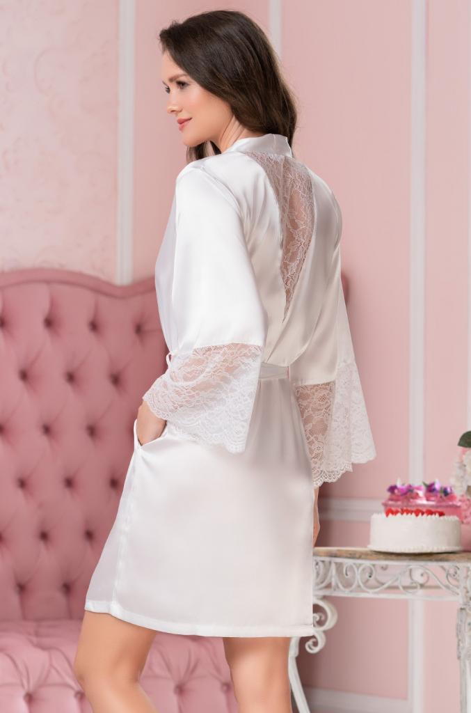 Элегантный короткий запашной халат Mia-Amore с длинными широкими рукавами, выполнен из однотонного искусственного шелка с блеском и кружевными вставками, которые расположены по низу рукавов и верху спинки. По бокам обработаны карманы.