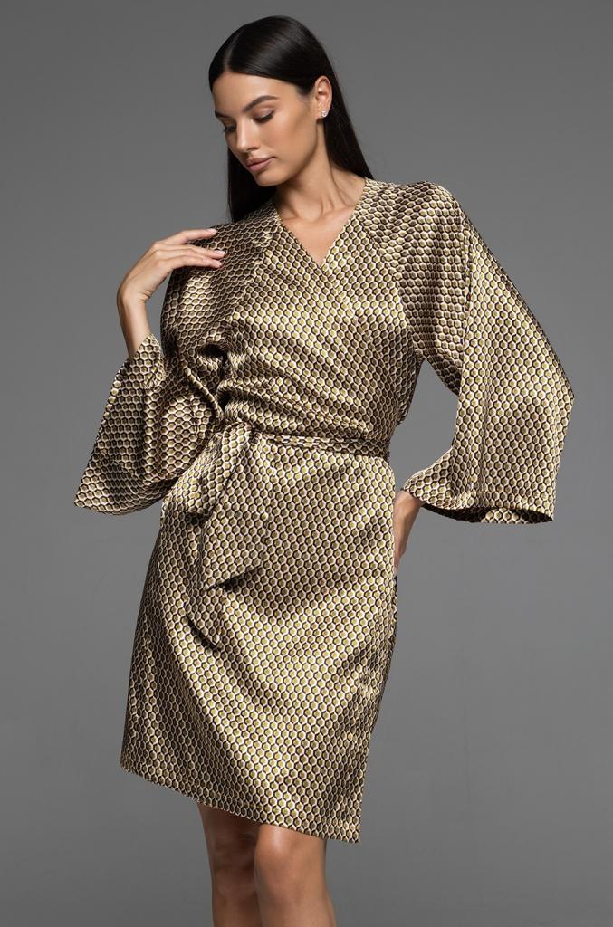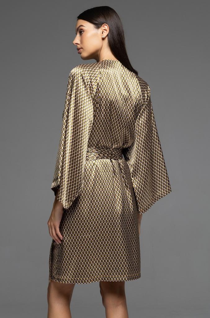 Короткий запашной халат Mia-Amore с длинным широким рукавом, который можно так же носить в качестве платья и использовать для дневных выходов. Изделие выполнено из искусственного принтованного шелка. В боковых швах расположены карманы.