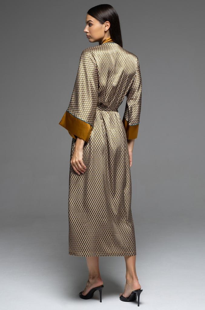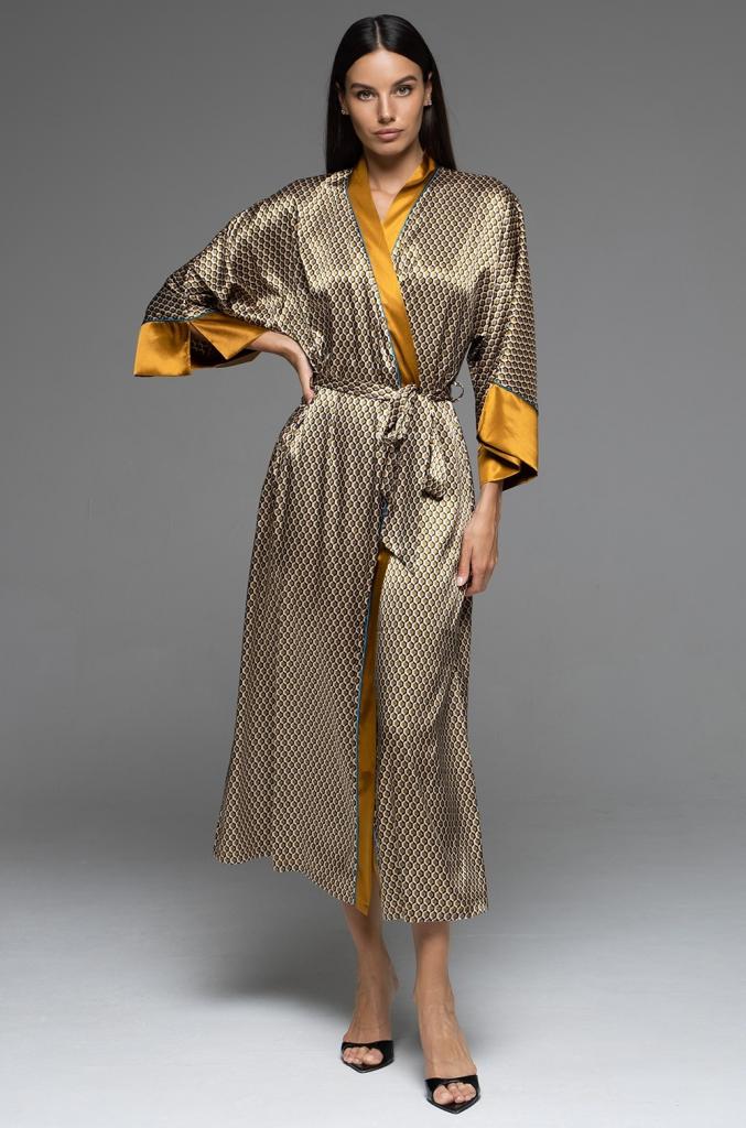 Длинный запашной халат Mia-Amore с широким длинным рукавом. Халат выполнен из искусственного принтованного шелка с однотонной отделкой и контрастными кантами. В боковых швах расположены карманы.