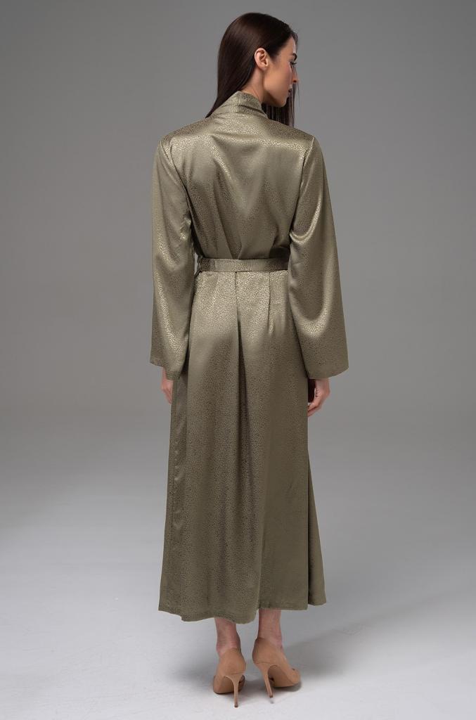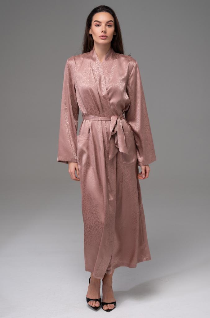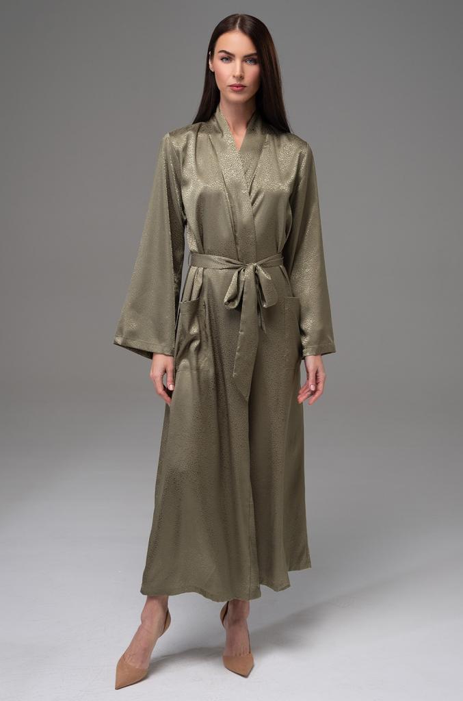Длинный запашной халат Mia-Amore с широким рукавом длиной 3/4. Халат выполнен из однотонного искусственного шелка на жаккардовой основе. По бокам изделия обработаны карманы. Линия талии подчеркивается за счет широкого пояса.