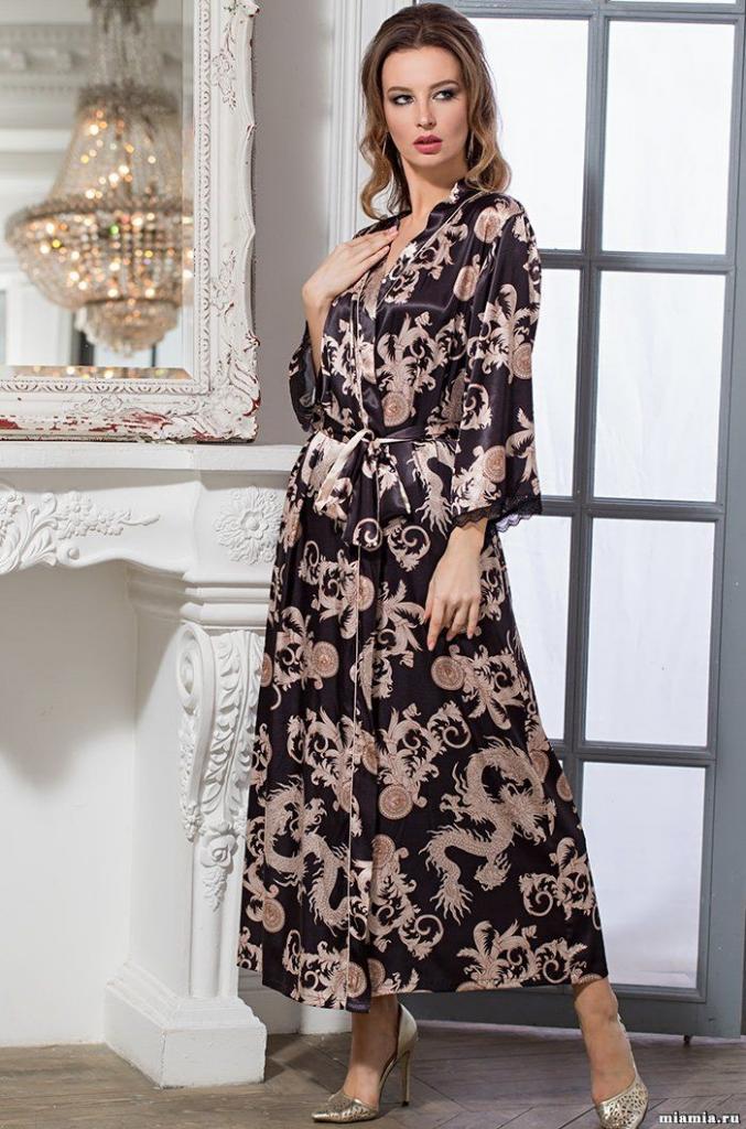 Длинный халат Mia-Mella с длинными рукавами выполнен из принтованного искусственного шелка. Рукава халата декорированы тонким кружевом.
