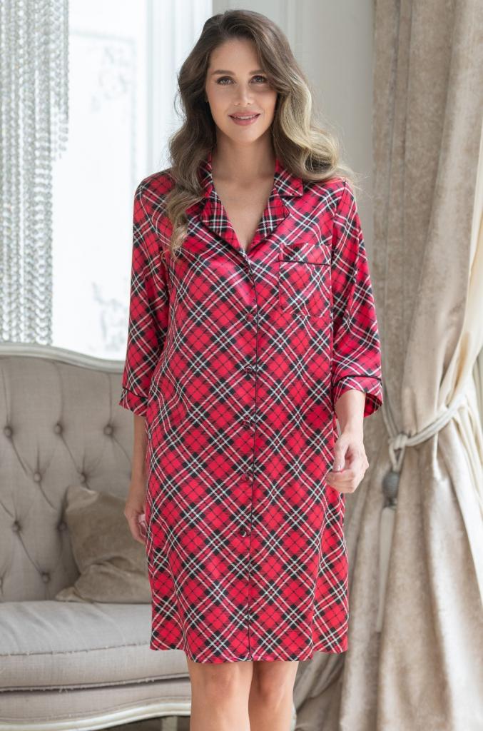 Рубашка Mia-Amore с центральной застежкой на пуговицы на пуговицах с рукавами длиной 3/4, выполнена из принтованного искусственного шелкового полотна с атласным блеском. Низ рукавов, борт и воротник декорированы контрастным кантом.