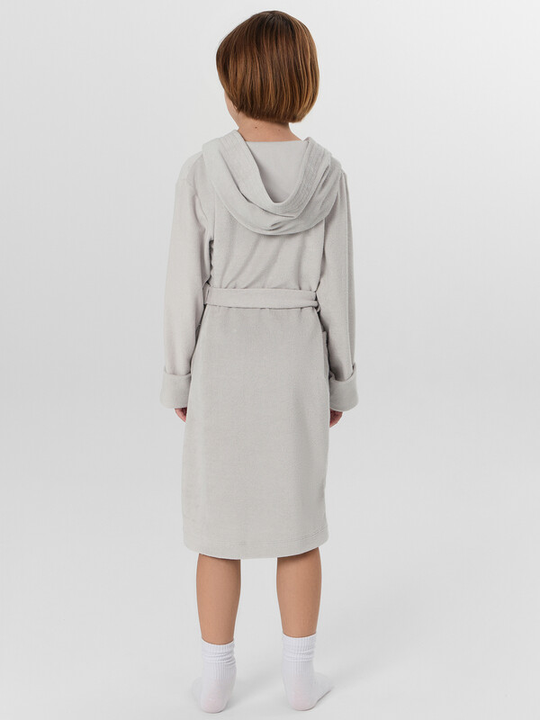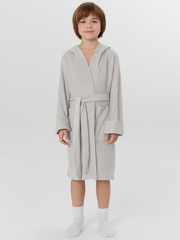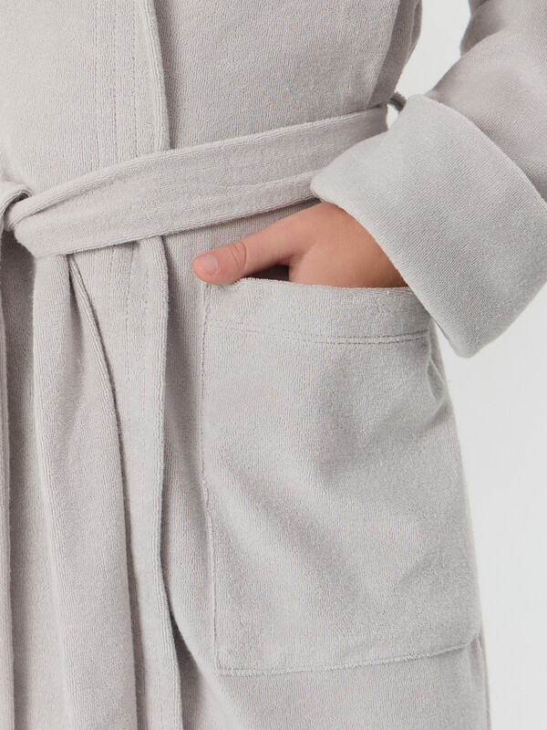 Концы пояса свободно завязываются. Карманы настрочные. Рукава длинные. По низу рукавов манжеты. Спинка цельнокроеная. Низ изделия обработаны на 2-х игольной плоскошовной машине. По низу рукавов манжеты.