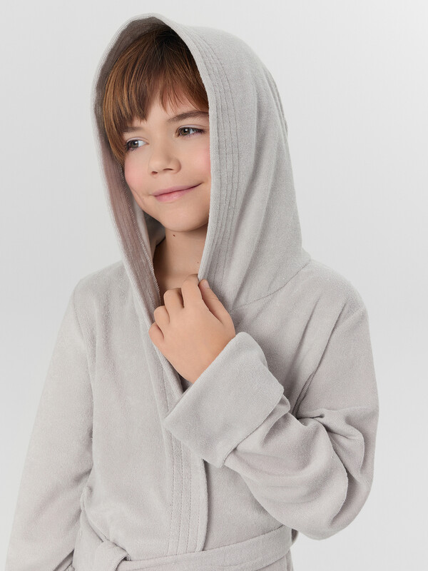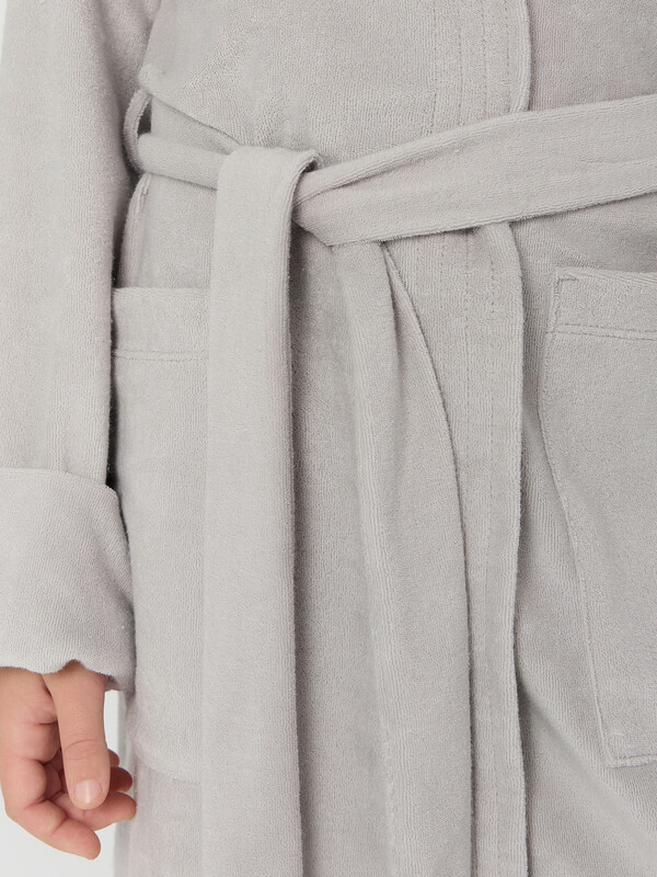 Халат с запахом, с съемным поясом, продетым в шлевки в боковых. Рукава длинные, одношовные.