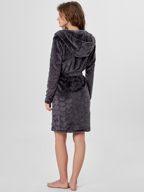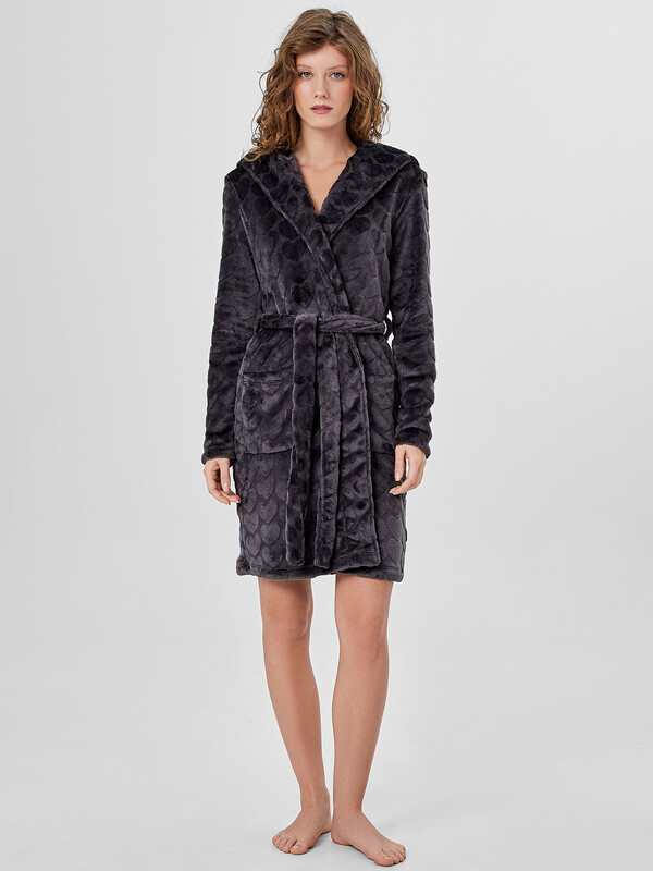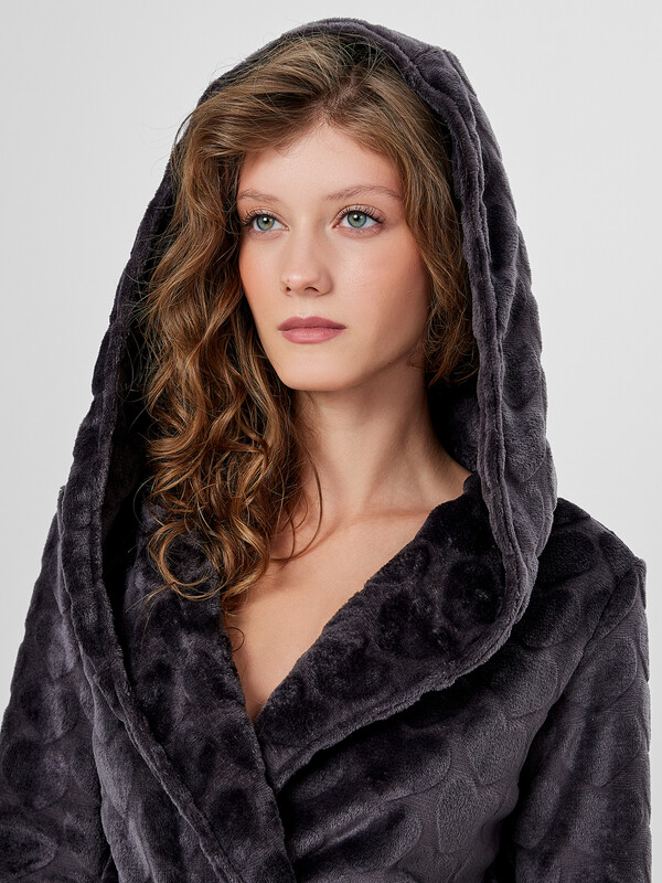 Халат оснащен удобным капюшоном, который дополняет образ и обеспечивает дополнительный комфорт. Пояс с петлями позволяет отрегулировать посадку по фигуре, а накладные карманы с закругленным низом добавляют практичности. Длинные рукава и аккуратная отделка бортов и капюшона делают халат элегантным и завершенным.