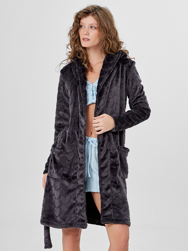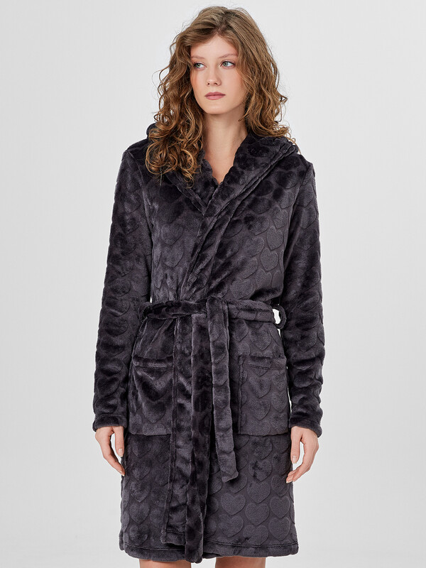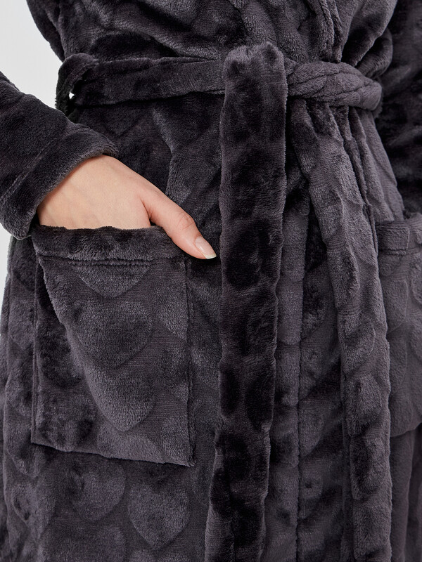 Серый женский халат с узором сердечек — это уют и нежность для вашего отдыха. Модель прямого силуэта ниже колен выполнена из мягкого полиэстера, который обеспечивает легкость, простоту ухода и сохранение формы после стирки.
