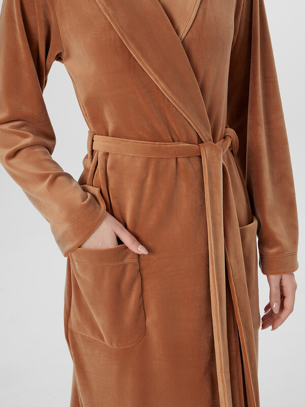 Бархатистый велюр с добавлением эластана мягко облегает фигуру, сохраняя тепло и даря невероятные тактильные ощущения. В этом халате так приятно пить утренний кофе, читать книгу вечером или встречать близких — вы всегда будете выглядеть собранной и элегантной даже в моменты отдыха.