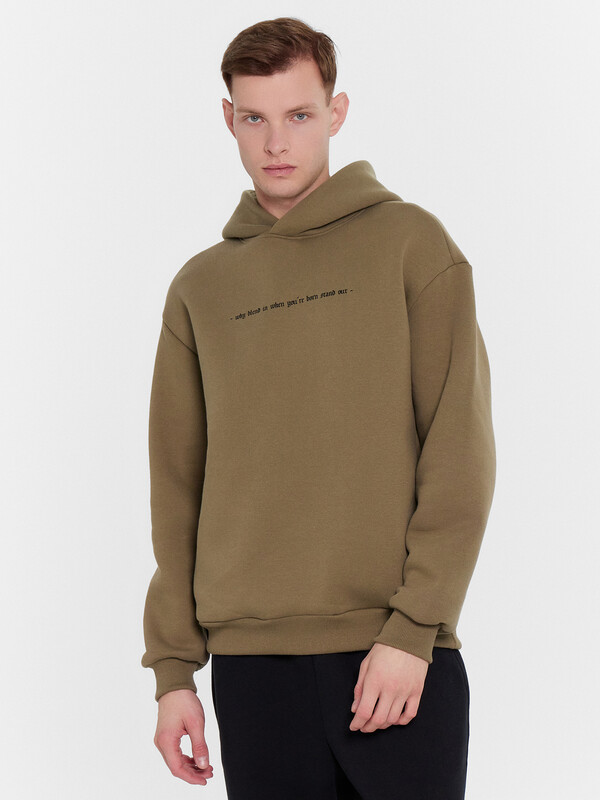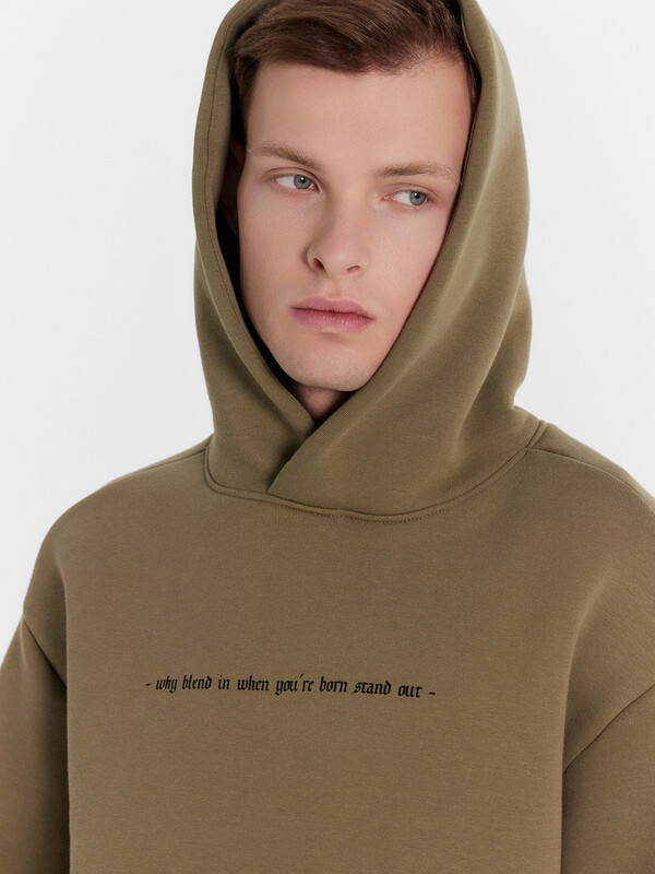 Худи мужское объемного силуэта из высококачественного хлопка с печатью в виде надписи "When blend in when you are born stand out / Будьте индивидуальны, не просто следуйте тому, что делают все остальные, будьте самим собой". Выполнено из мягкого футера с теплым подчесом. Удобные карманы в боковых швах, круглая горловина с капюшоном, длинные рукава на манжетах, спущенное плечо и углубленная пройма – это худи удачно сочетает в себе комфорт, актуальный дизайн и качество. Отличный вариант для создания стильных и лаконичных образов на каждый. Худи уже давно стало базовым элементом гардероба большинства мужчин, его любят за универсальность и возможность сочетать с большим количеством вещей. В нем комфортно и тепло. Рекомендуем для создания уютных образов. Порадуйте себя и своих близких универсальными подарками мужской базовой одежды от Mark Formelle!