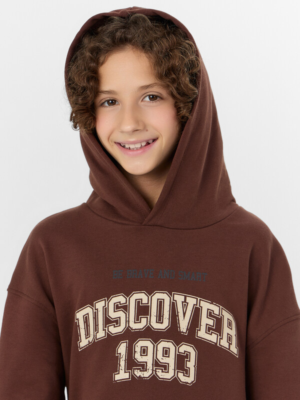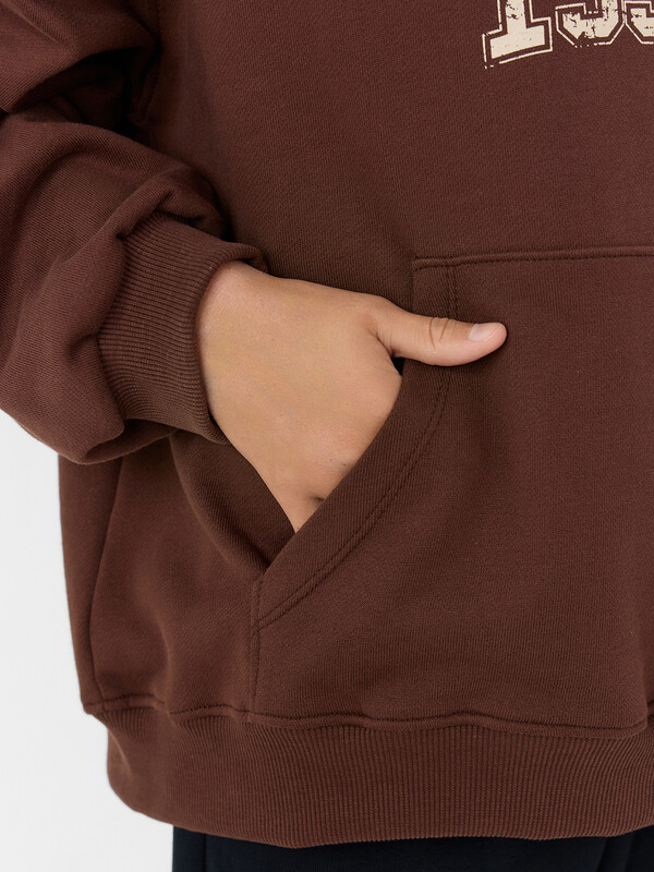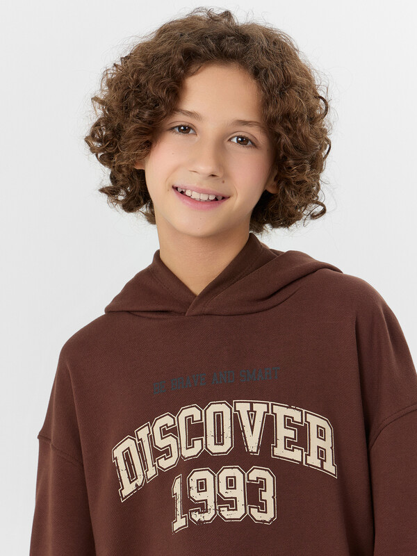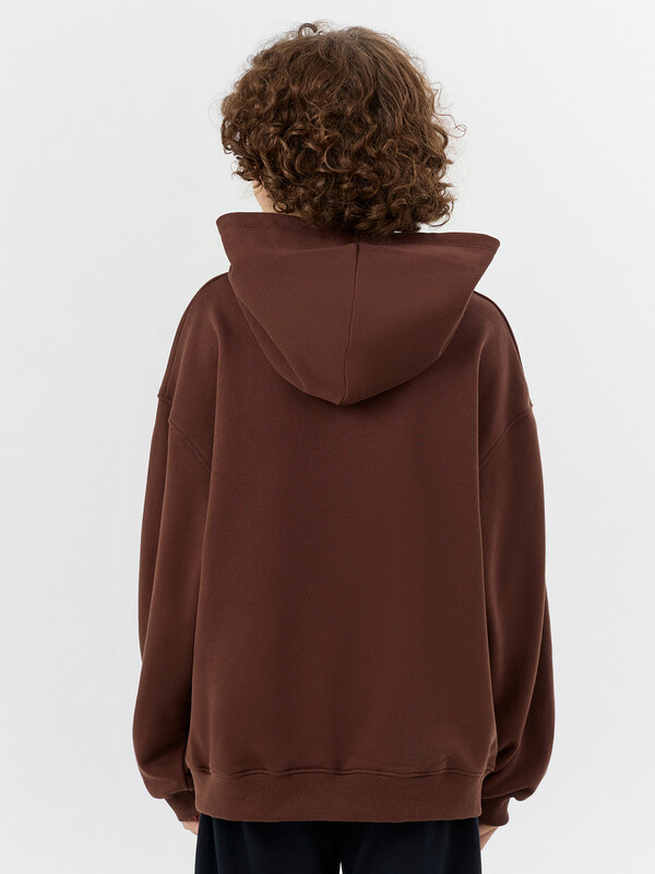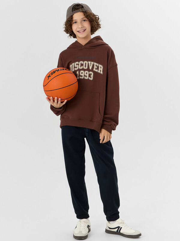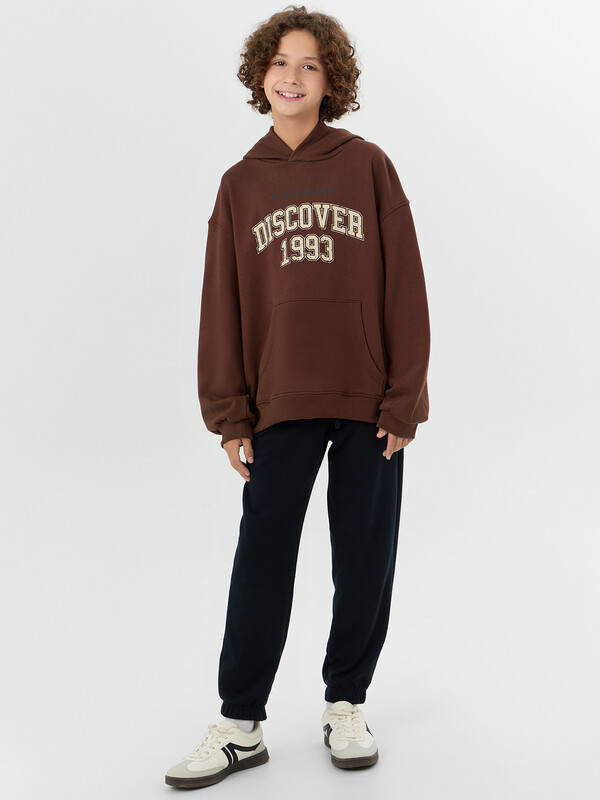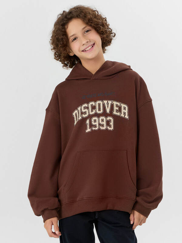 Худи для мальчиков, свободного силуэта (оверсайз), с капюшоном. Горловина округлой формы. Капюшон со средним швом, на подкладке из основного полотна. Шов втачивания капюшона закрыт хб тесьмой. Плечо спущено, рукав втачной длинный. По низу рукава отрезная манжета из рибаны. Пояс отрезной из рибаны, отстрочен. По переду карман кенгуру.