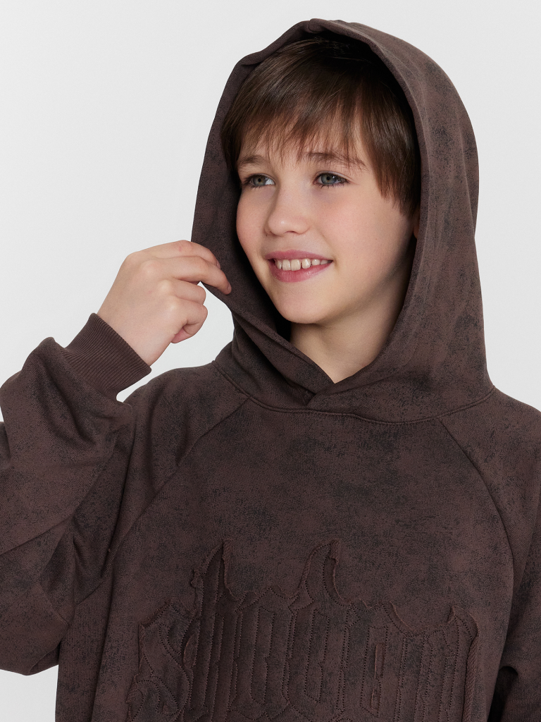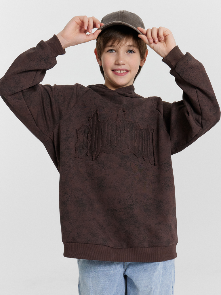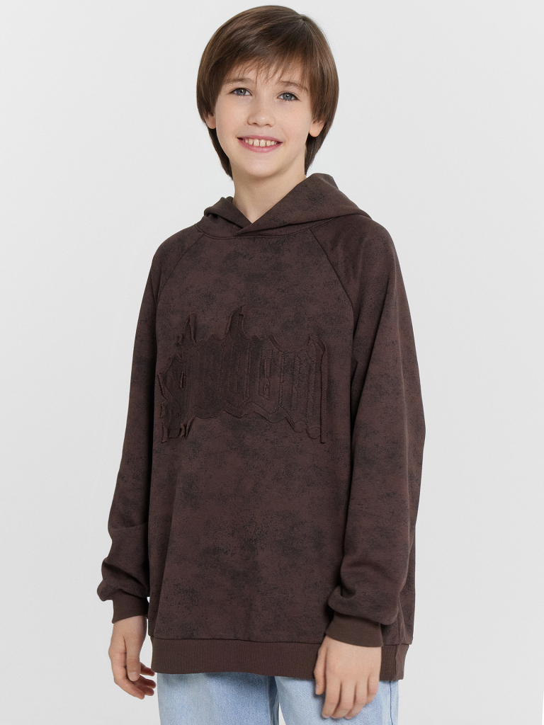 Утепленное худи для мальчиков, выполненное из дегкого трикотажного футера. Силуэт прямой, расслабленный. Вырез круглый, с объемным капюшоном. Рукава длинные и объемные, с манжетами. Мальчику наверняка понравятся принты и цвет этого худи