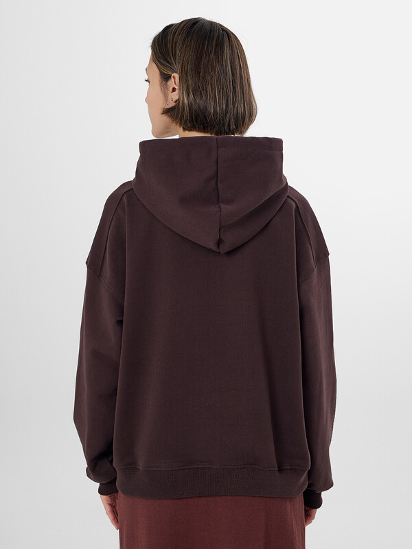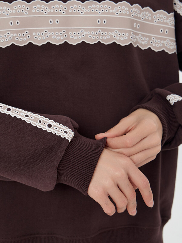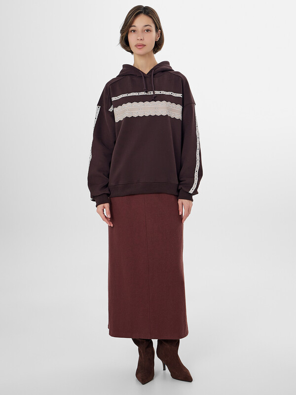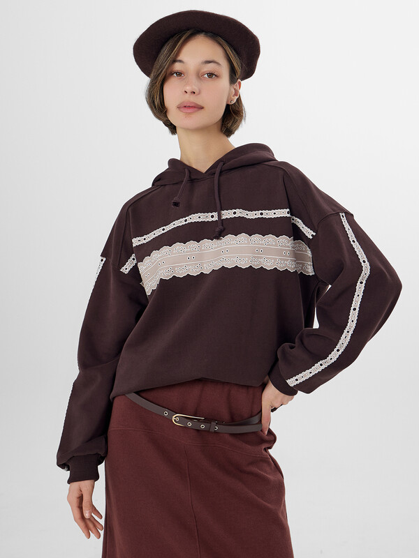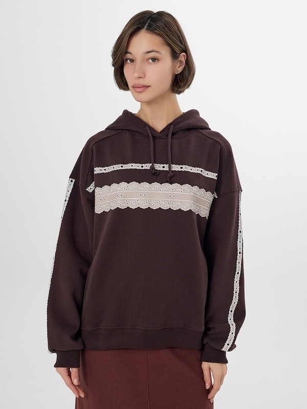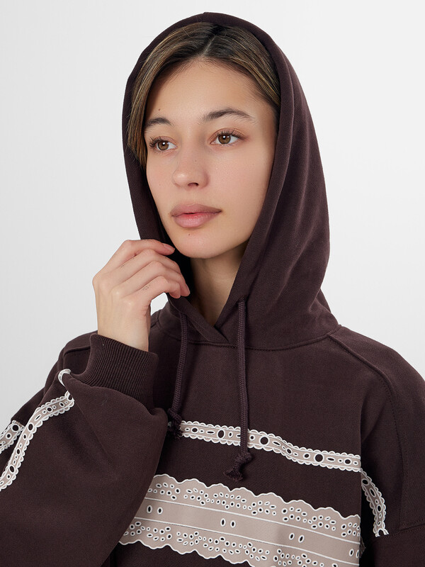 Коричневое женское худи с изящным кружевным принтом — уютная и стильная модель для повседневной носки. Свободный крой из мягкого трехниточного футера с начесом обеспечивает комфорт и сохраняет тепло в прохладную погоду. Расслабленный силуэт со спущенным плечом и капюшоном на шнурке создает современный образ, а эластичные манжеты и пояс из рибаны обеспечивают аккуратную посадку.