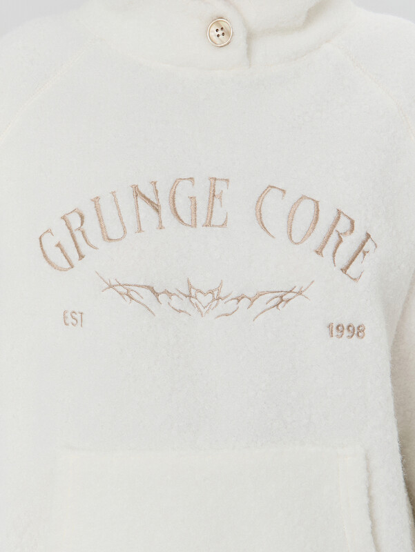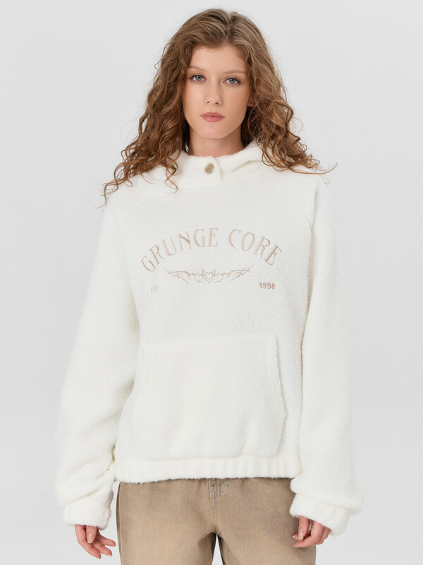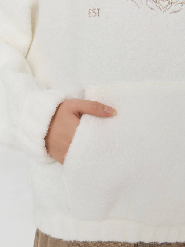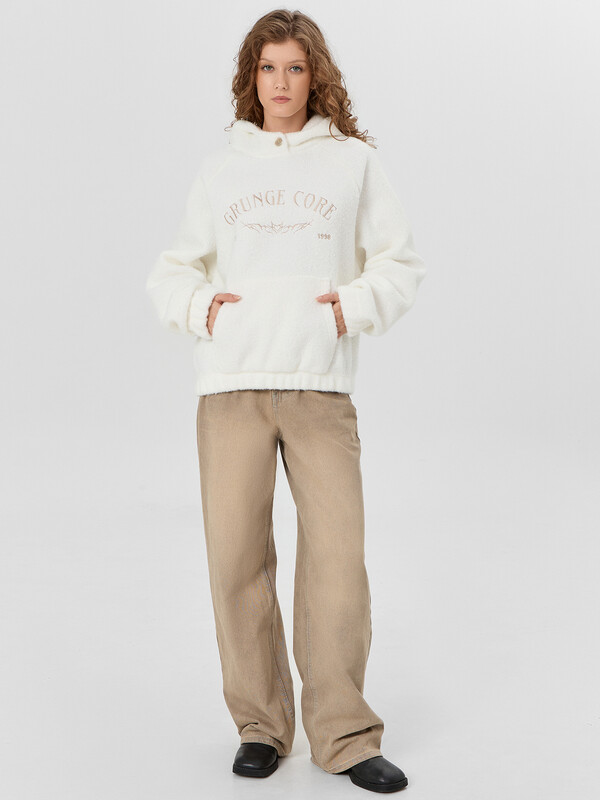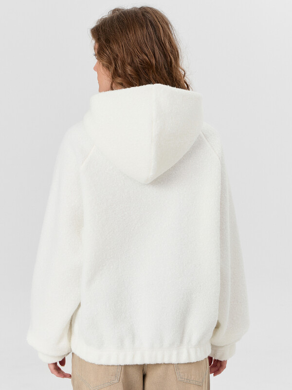 Молочное женское худи создано для комфорта в прохладную погоду. Модель свободного кроя из мягкой шерпы обеспечивает тепло и уют. Рукава реглан плавно переходят в линию плеча, не ограничивая движений, а эластичные резинки по низу и на рукавах сохраняют форму изделия.