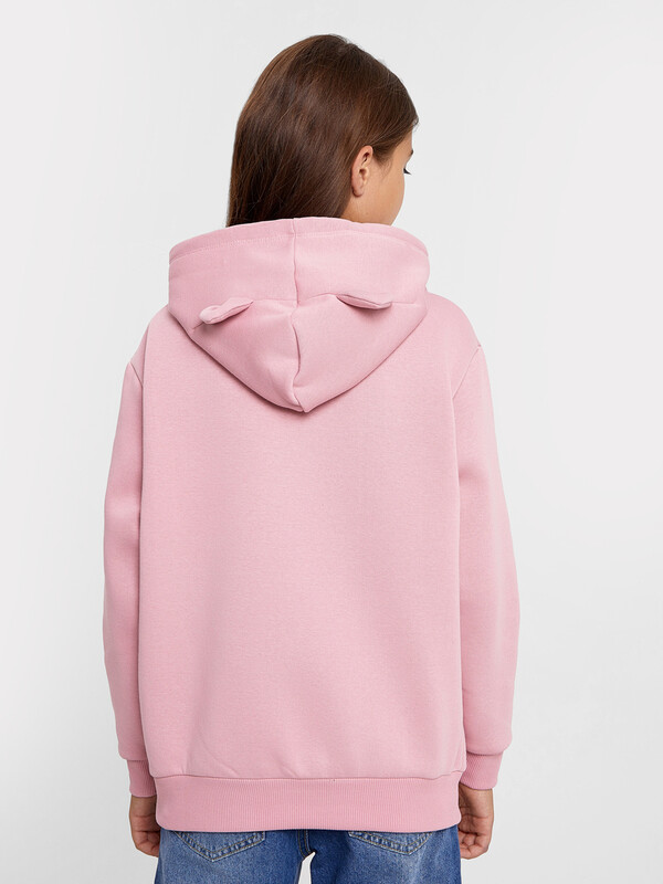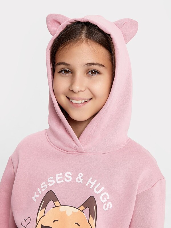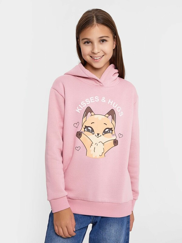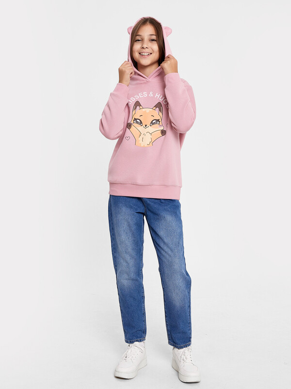 Стильное худи оверсайз для девочек, созданное из трикотажного футера с теплым начесом. В основе состава — высококачественный хлопок. Округлая горловина, просторный уютный капюшон с декоративными ушками, длинные рукава на манжетах и карман-кенгуру – ничего лишнего. Дополнительную свободу дарит спущенная линия плеча. Отличный вариант для вашей девочки!