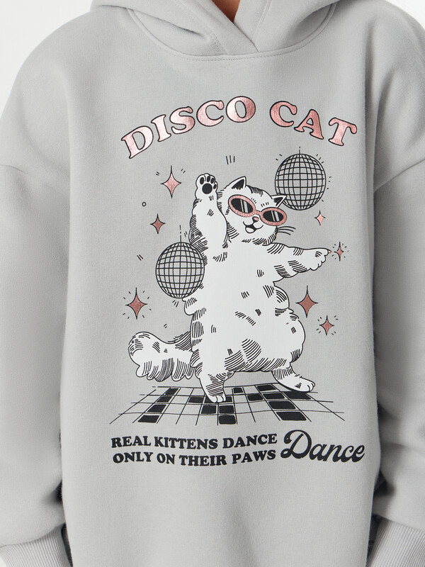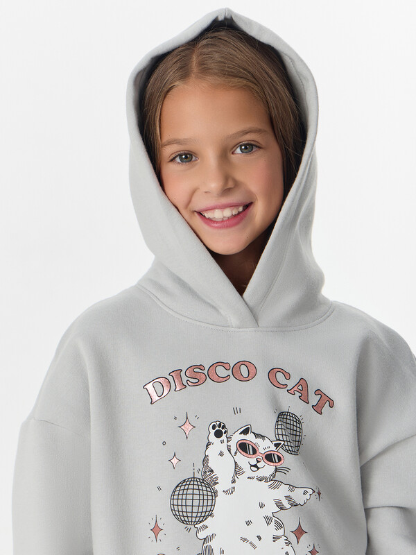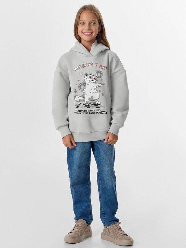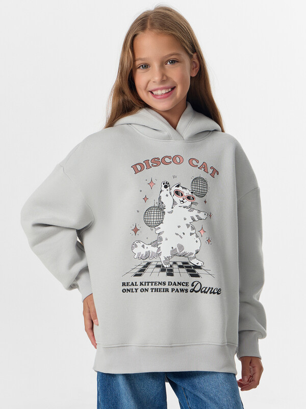 Серое худи для девочек с надписью «Диско-кот. Настоящие котята танцуют только на лапках. Танцуй» — это стильная и уютная вещь для повседневной носки. Модель силуэта оверсайз выполнена из мягкого трикотажного футера с начесом.