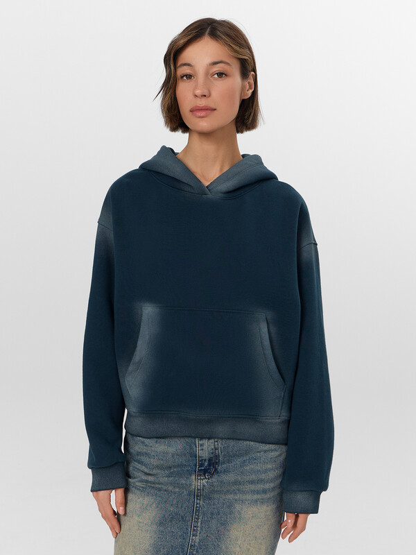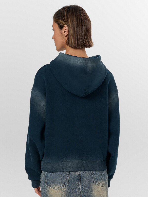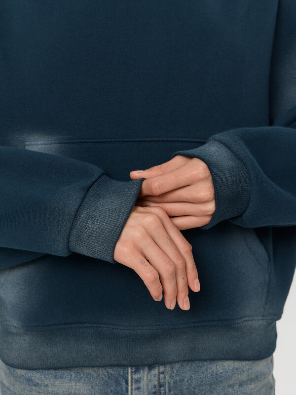 Эластичные манжеты и пояс из рибаны хорошо держат форму. Капюшон и вместительный карман делают модель еще более удобной. Искусственные потертости с мелкими надрывами по краям капюшона, кармана и манжет придают худи уникальный винтажный характер.