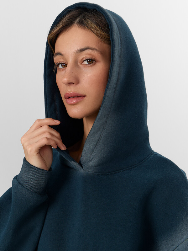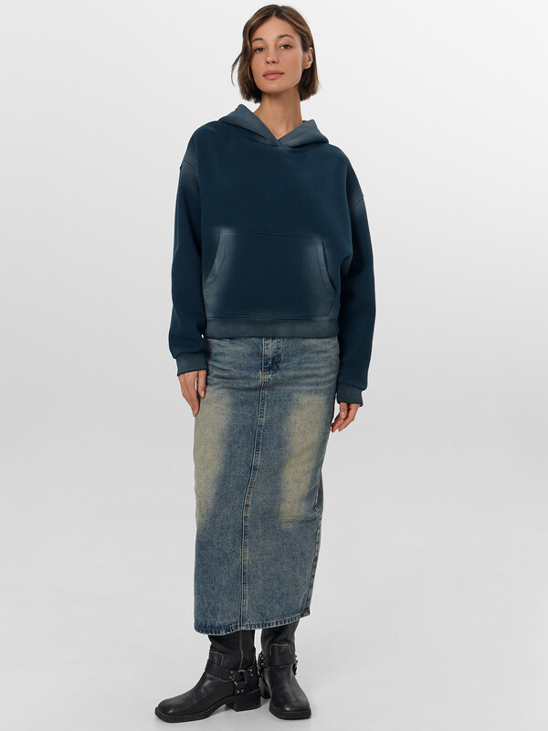 Зеленое худи свободного кроя с начесом и эффектом потертости — удобная и стильная модель на каждый день. Передняя и задняя часть выполнены из цельного отрезка ткани, что обеспечивает удобную посадку без лишних швов. Мягкий начес внутри создает дополнительное ощущение уюта и прекрасно сохраняет тепло. Длинные рукава со спущенным плечом создают мягкий, непринужденный силуэт.