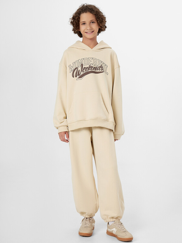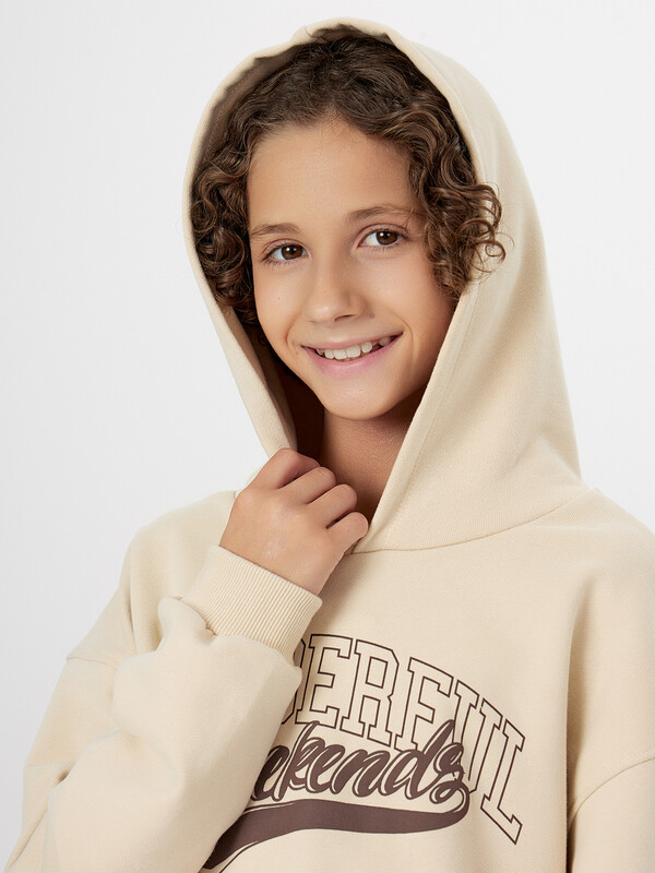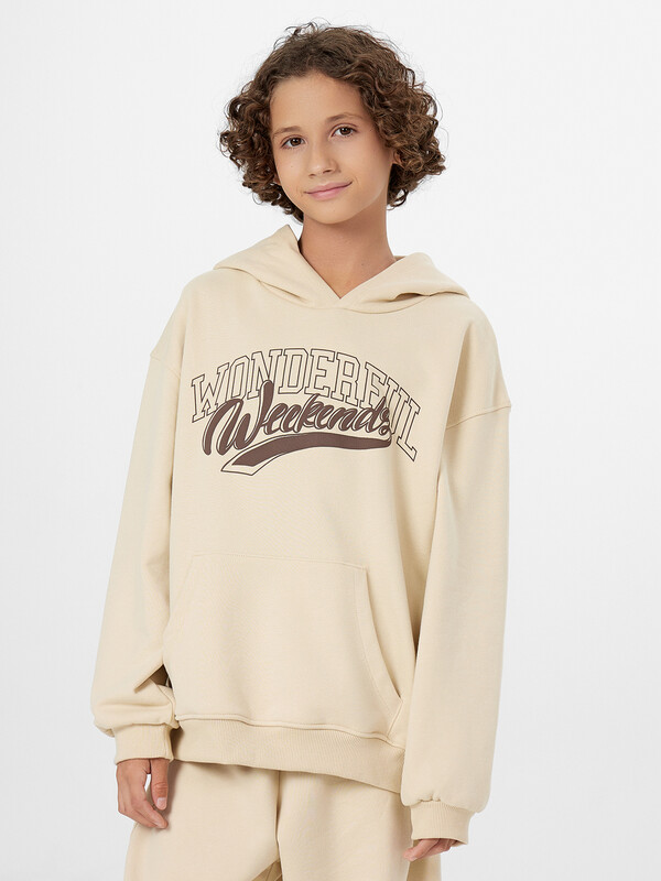 Худи оверсайз для мальчиков с надписью "Wonderful weekends" ("Прекрасные выходные") создано для активного образа жизни. Модель из хлопка отличается особой мягкостью и способностью пропускать воздух, что важно для подвижных детей.