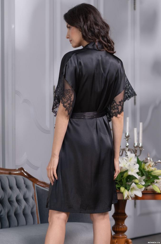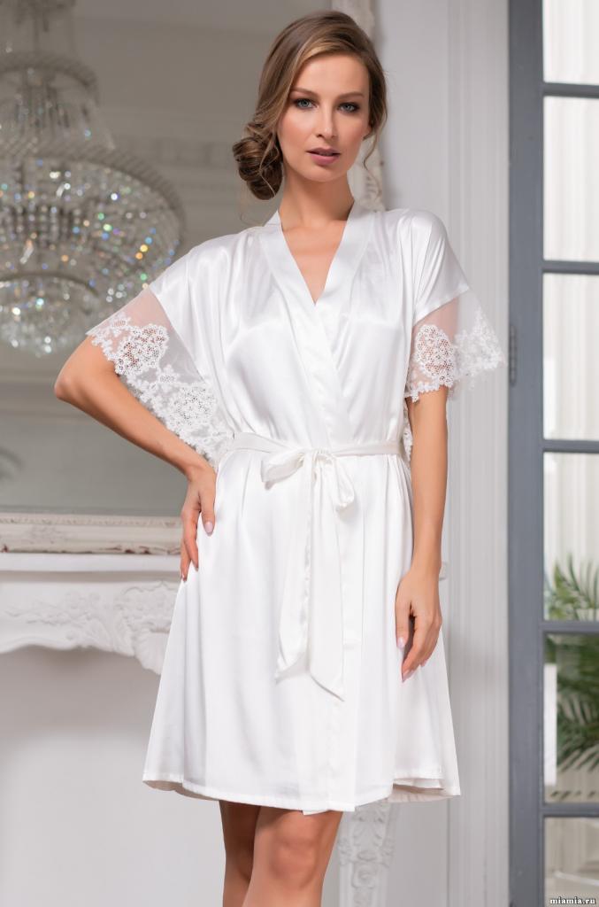 Запашной халат–пеньюар Mia-Amore с короткими кружевными рукавами, выполнен из смесового однотонного шелка. Кружево на рукавах инкрустировано кристаллами Swarovski.