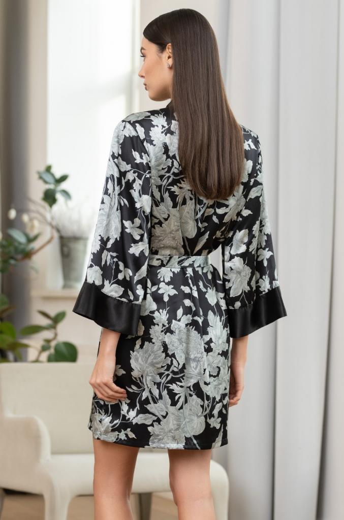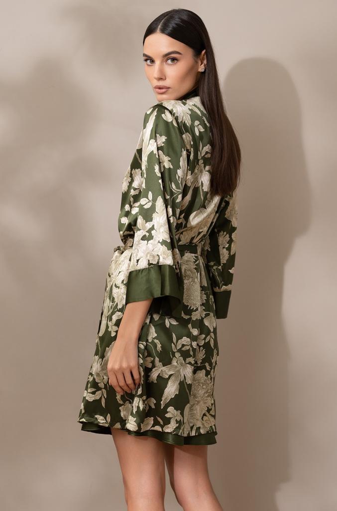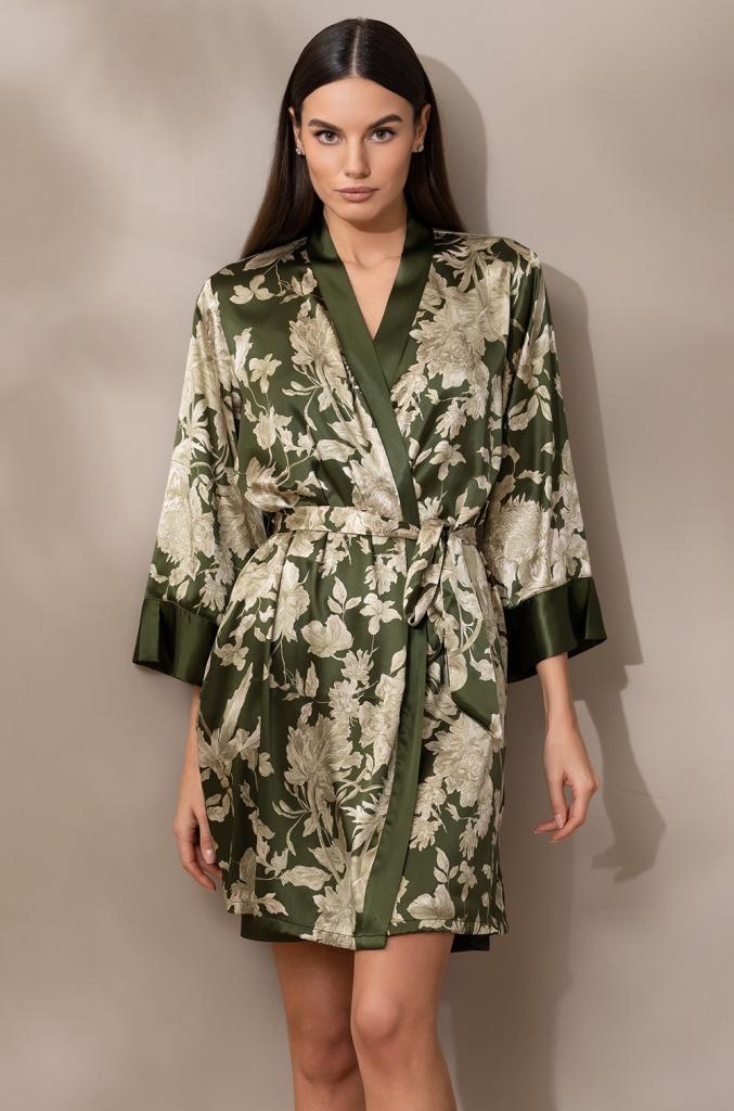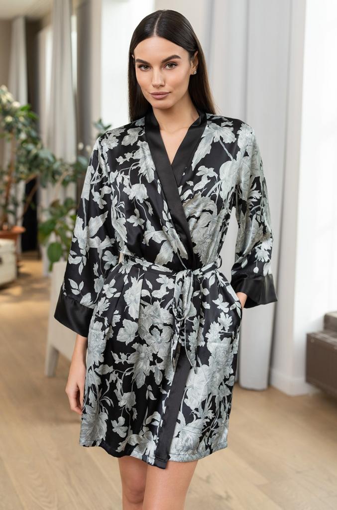 Короткий запашной халат Mia-Amore с широким рукавом длиной 3/4. Халат выполнен из принтованного смесового шелка с однотонной отделкой по бортам и низу рукавов. По бокам изделия обработаны карманы.