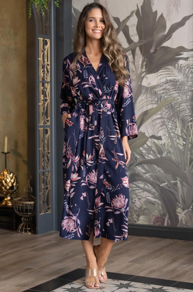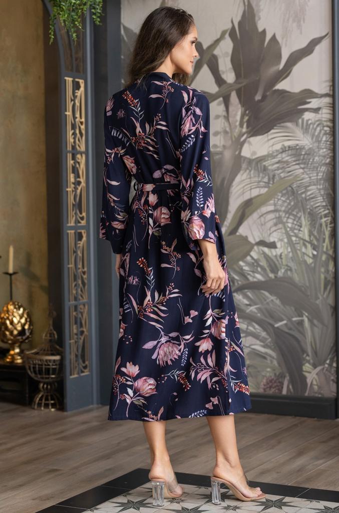 Длинный запашной халат Mia-Amore с длинными рукавами выполнен из принтованного вискозного полотна. По низу рукавов широкий манжет, халат комплектуется широким поясом, в боковых швах карманы.