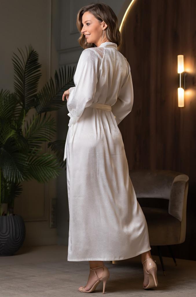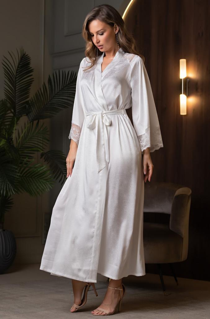 Элегантный длинный запашной халат Mia-Amore с длинными широкими рукавами, выполнен из однотонного искусственного шелка на жаккардовой основе и дополнен кружевными вставками, которые расположены по верху и низу рукавов. По бокам обработаны карманы.