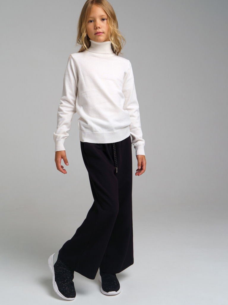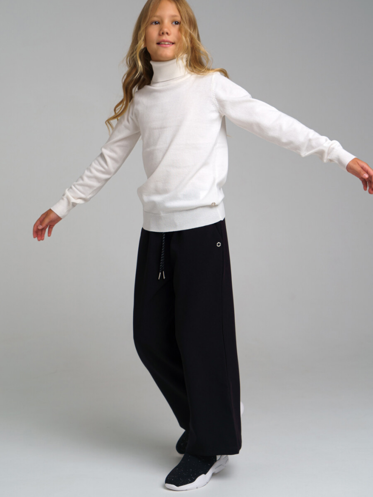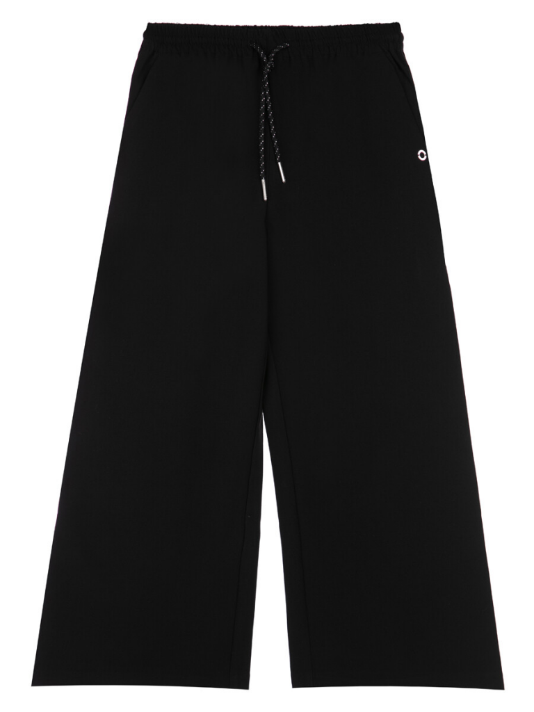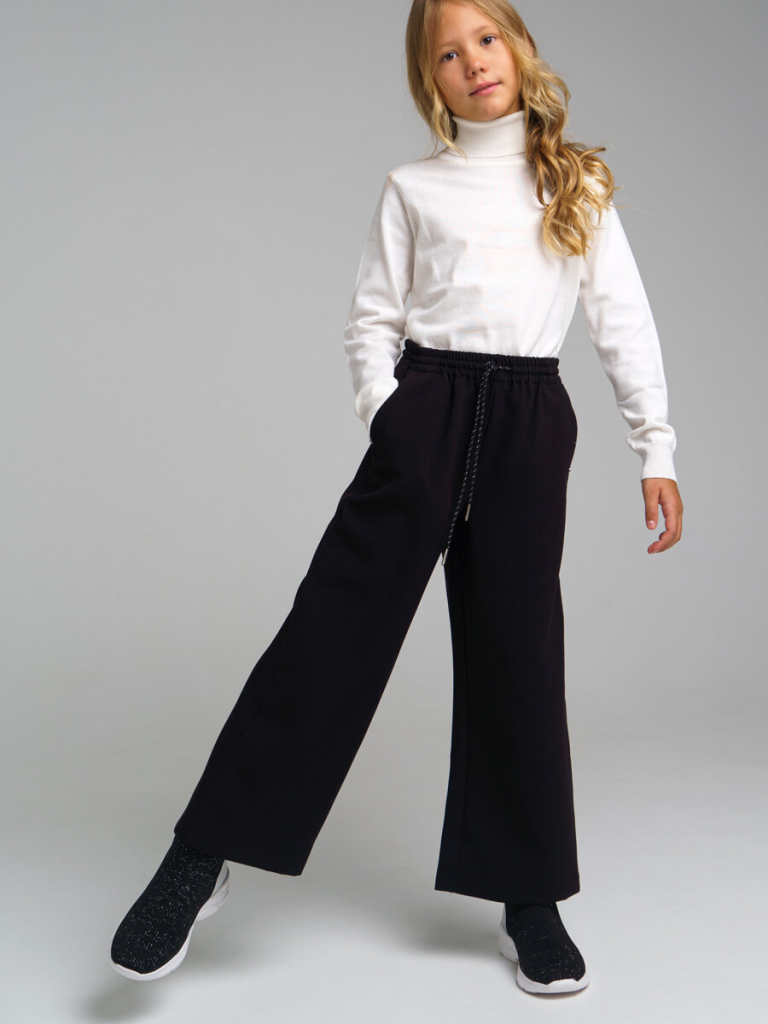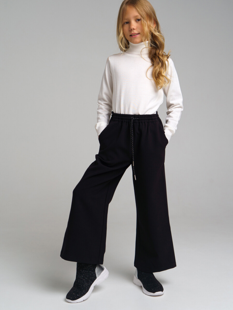 Школьные текстильные брюки-кюлоты для девочки подростка. Кюлоты (штаны) свободного силуэта (свободные) на резинке со шнурком идеально подойдут в школу. Классические черные брюки выполнены из ткани non-iron, которая не требует глажки после стирки. Брюки для школы имеют функциональные карманы в боковых швах, что очень удобно для школьницы.