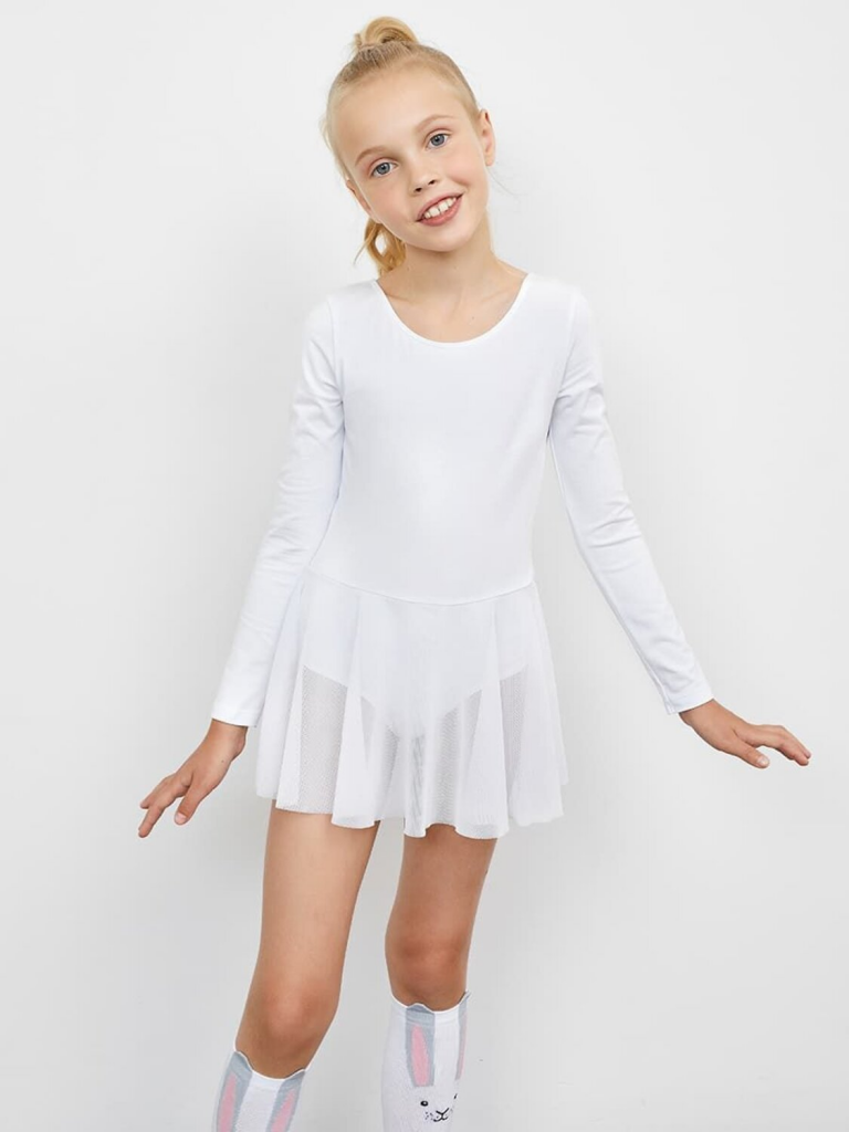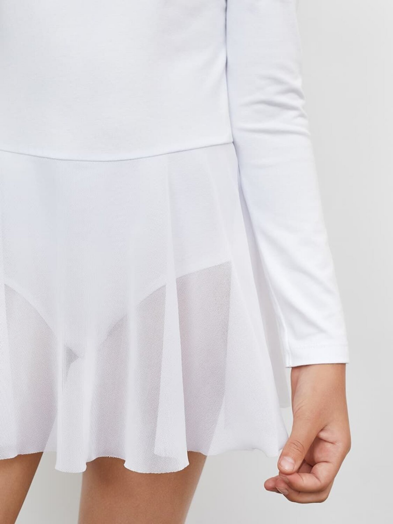Облегающий комбидрес для девочек. Изготовлен из хлопковой трикотажной кулирки с добавлением эластана и нейлона. Визуально напоминает закрытый купальник с сетчатой юбкой силуэта "полусолнце". Горловина круглая, на спинке вырез глубже, чем спереди. Рукава длинные, втачные. Срезы обработаны эластичной тесьмой. Удобно и стильно!