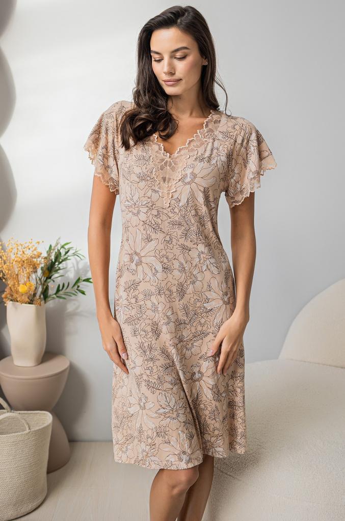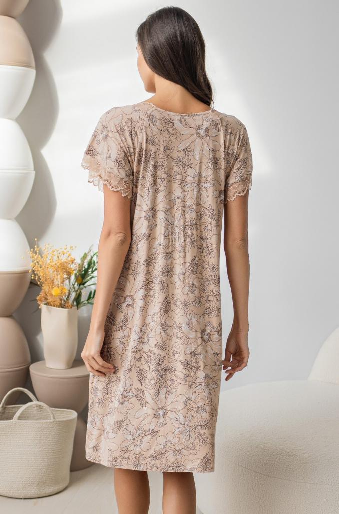 Длинная сорочка свободного силуэта Mia-Amore с коротким рукавом. Изделие выполнено из принтованного трикотажного полотна с кружевной отделкой по вырезу и низу рукавов. Центр выреза украшен атласным бантиком.