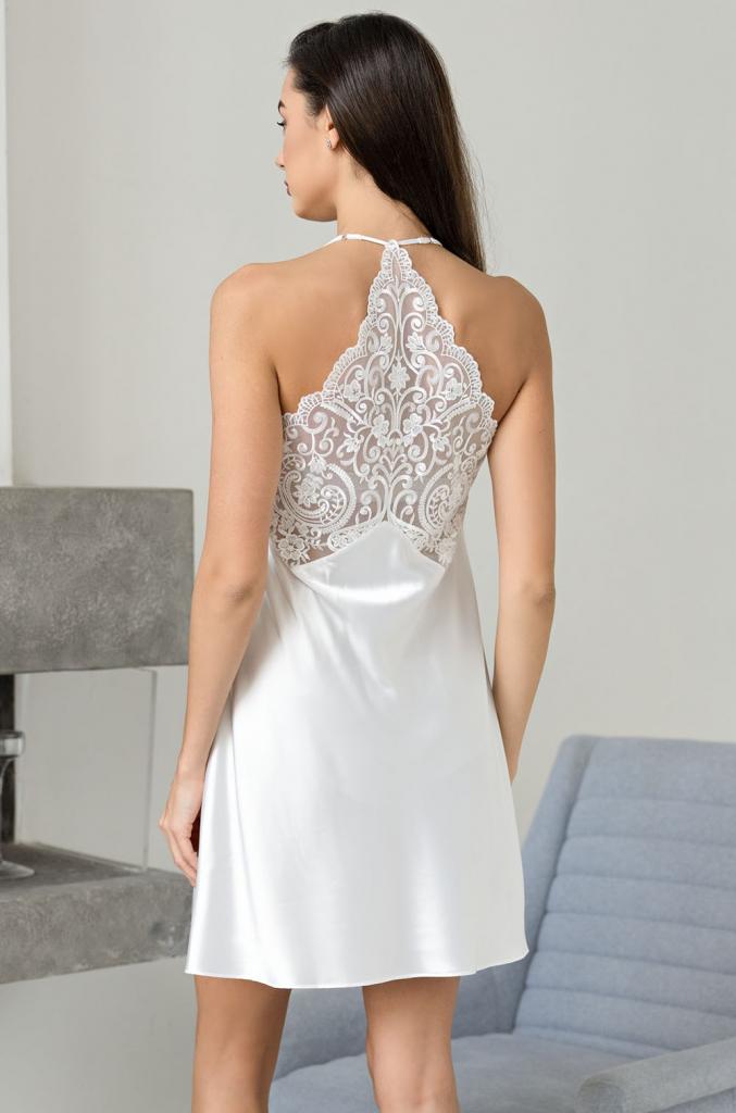 Короткая сорочка Mia-Amore без подреза на тонких регулируемых бретелях выполнена из однотонного смесового шёлка. Центр спинки украшает элемент из вышивного кружева. Верх лифа декорирован узким вышивным кружевом. По центру спереди расположен декоративный бантик с подвеской.