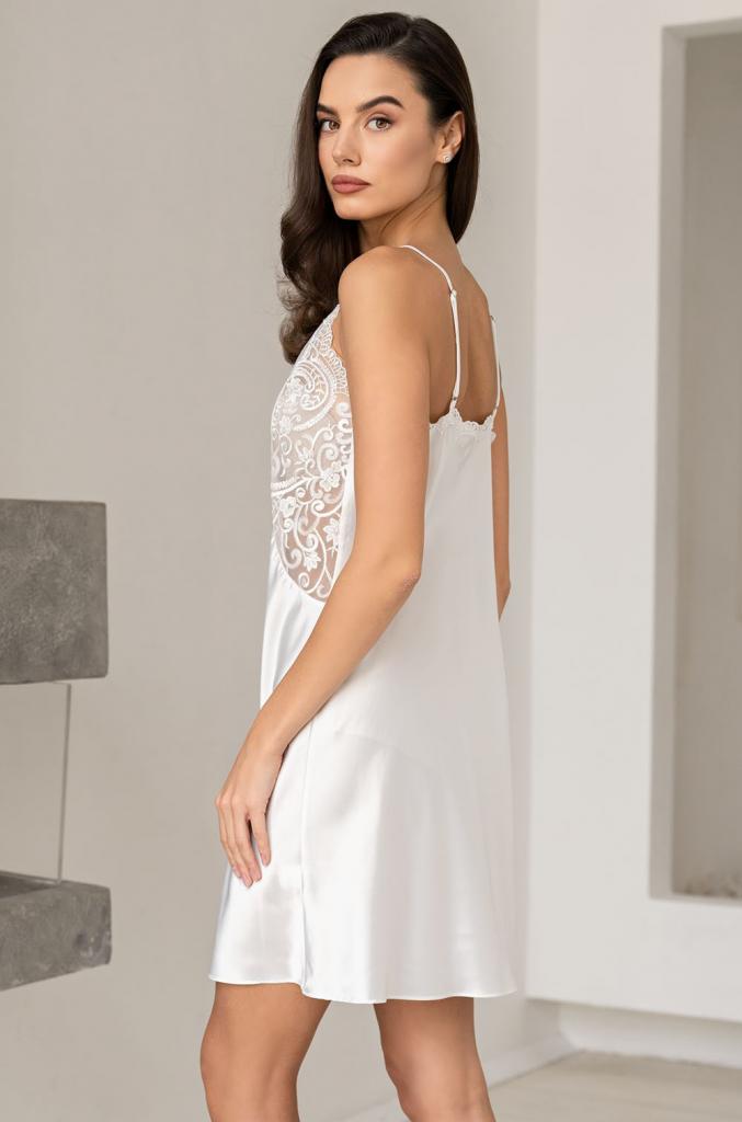 Короткая сорочка Mia-Amore без подреза на тонких регулируемых бретелях выполнена из однотонного смесового шёлка. Сбоку сорочку украшают вставки из элементов вышивного кружева. Верх лифа декорирован узким вышивным кружевом. По центру спереди расположен декоративный бантик с подвеской.