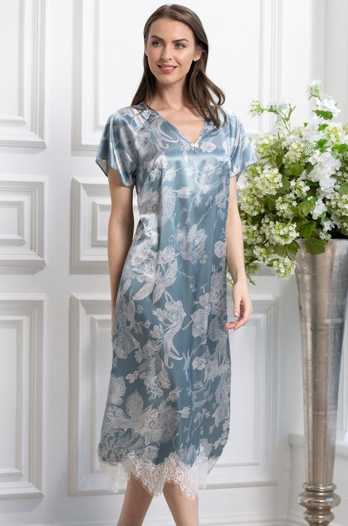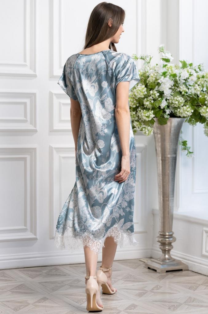 Удобное свободное домашнее платье-туника Mia-Amore со спущенными плечами, V-образной горловиной, длиной ниже колен. Туника выполнена из смесового принтованного шёлка нежного ментолового цвета.По низу туника украшена широким ажурным кружевом молочного цвета.