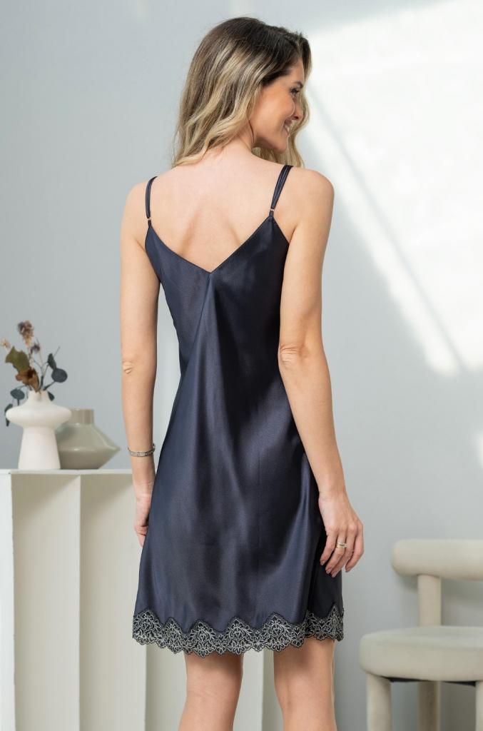 Короткая сорочка Mia-Amore на тонких бретелях, без подреза под грудью. Изделие выполнено из однотонного смесового шелка. Вышивное двухцветное кружево украшает вырез и низ сорочки. Декор - атласный бантик с подвеской, расположенный по вырезу сорочки.