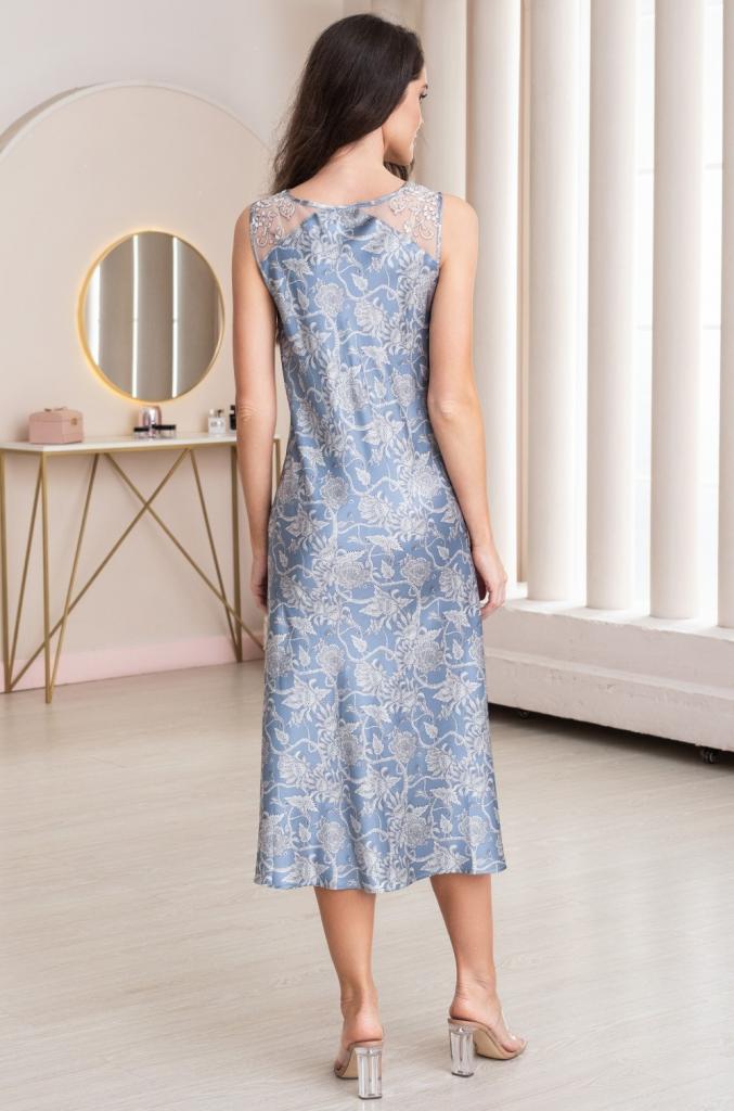 Длинная сорочка Mia-Amore полуприлегающего силуэта на широких кружевных бретелях, без подреза под грудью, выполнена из принтованного смесового шелка. Декор - маленький атласный бантик с подвеской по центру выреза сорочки.