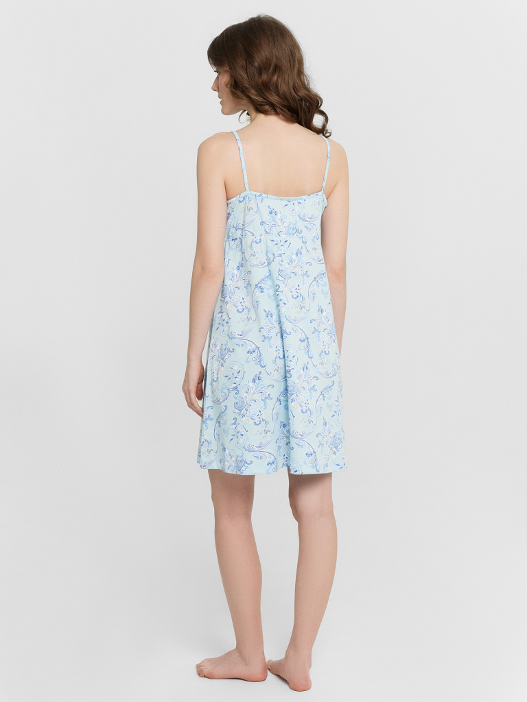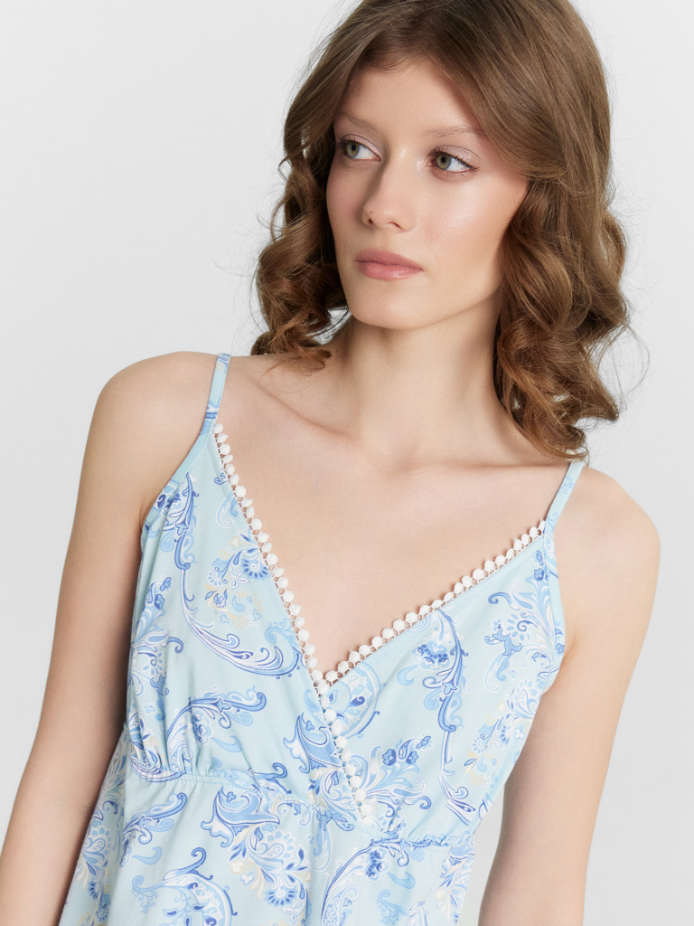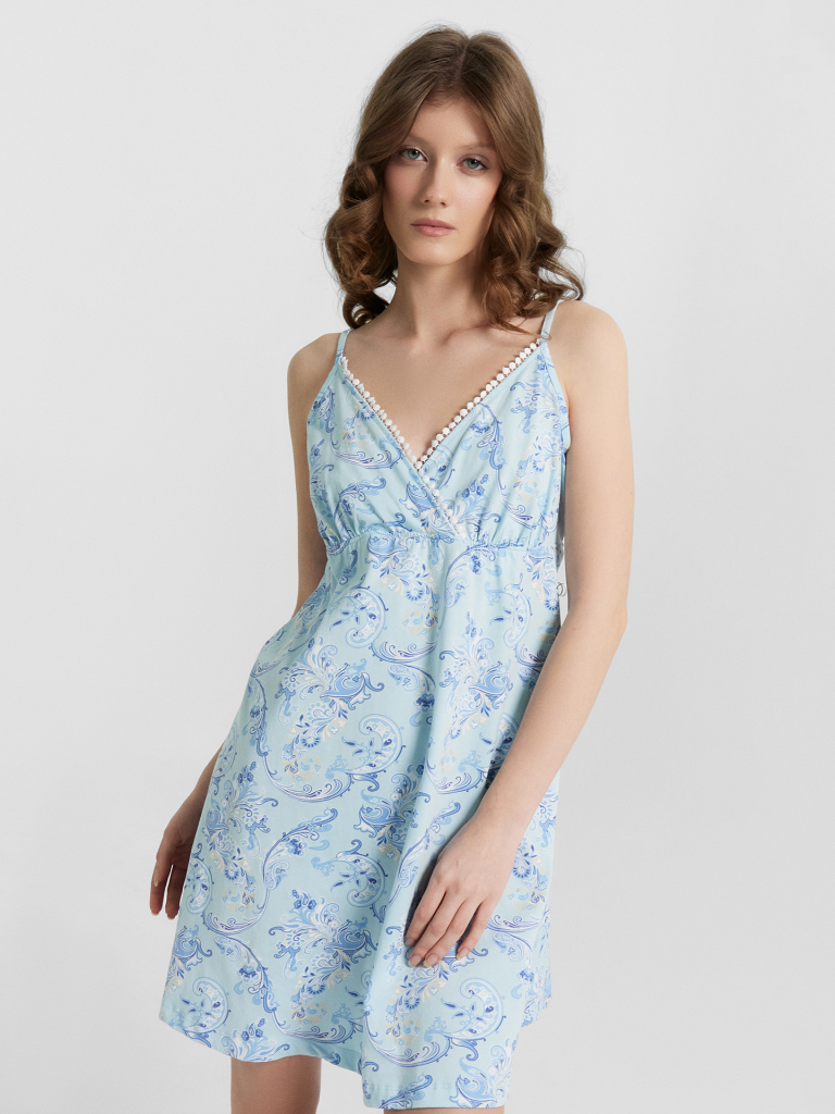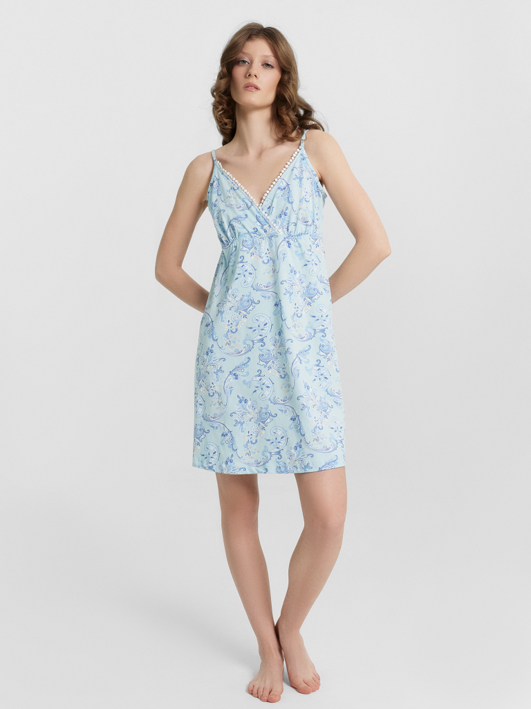 Стильная ночная сорочка из натурального хлопка . Длина миди, свободный расширяющийся силуэт, v-образный вырез горловины, декоративная тесьма на срезе декольте... В такой сорочке сны будут исключительно приятными! .